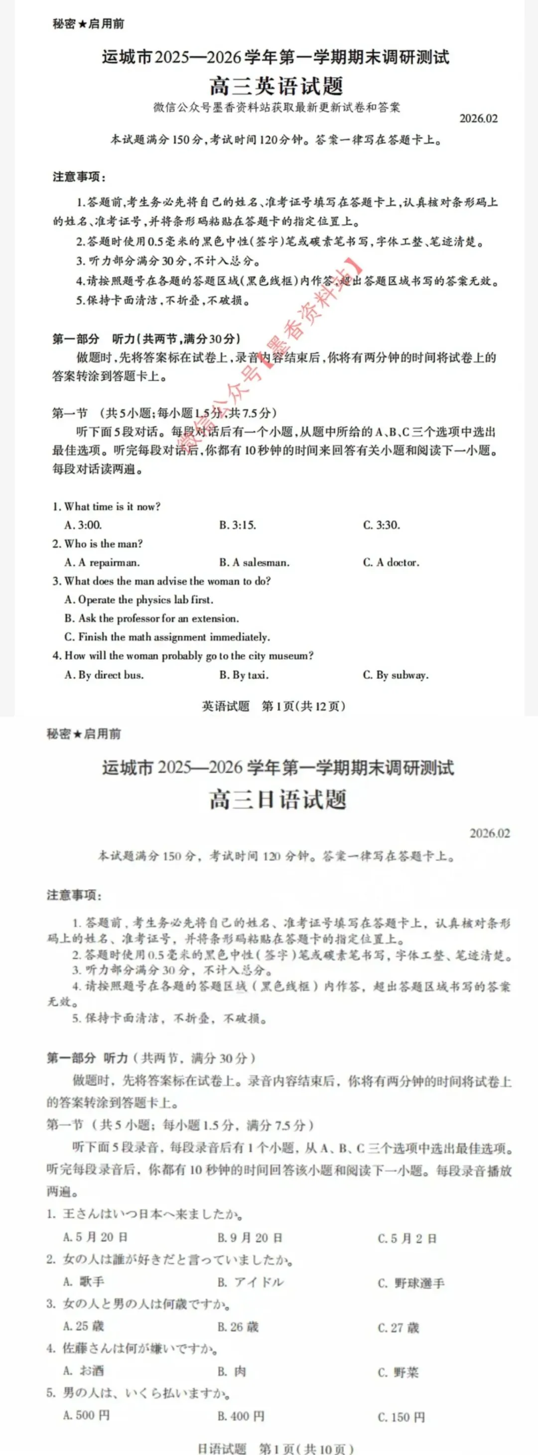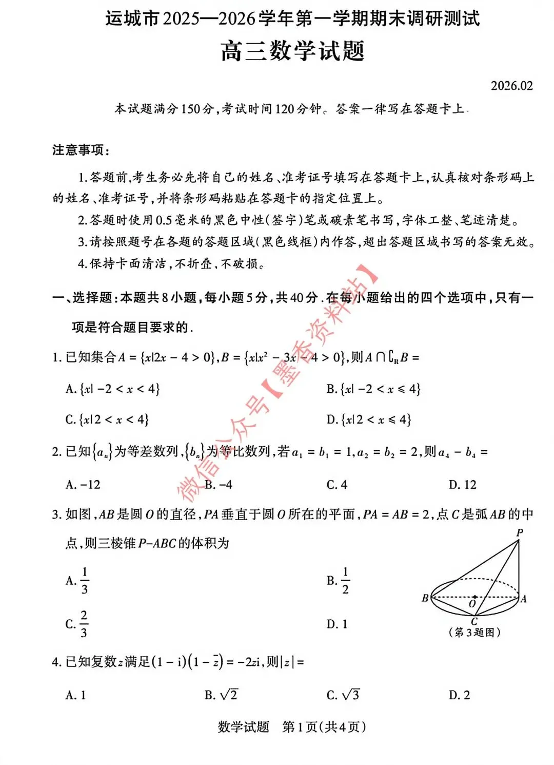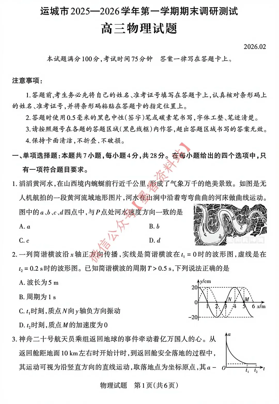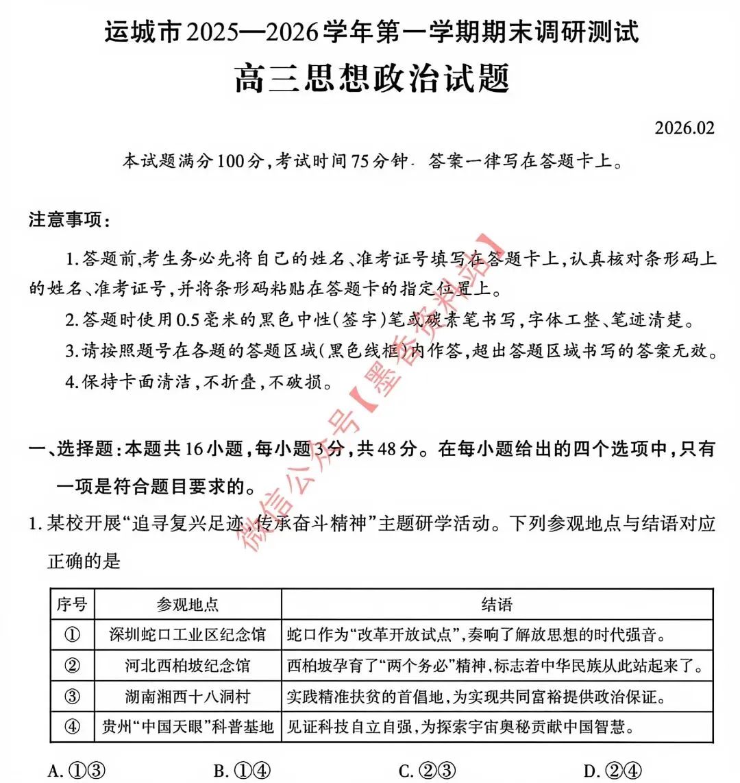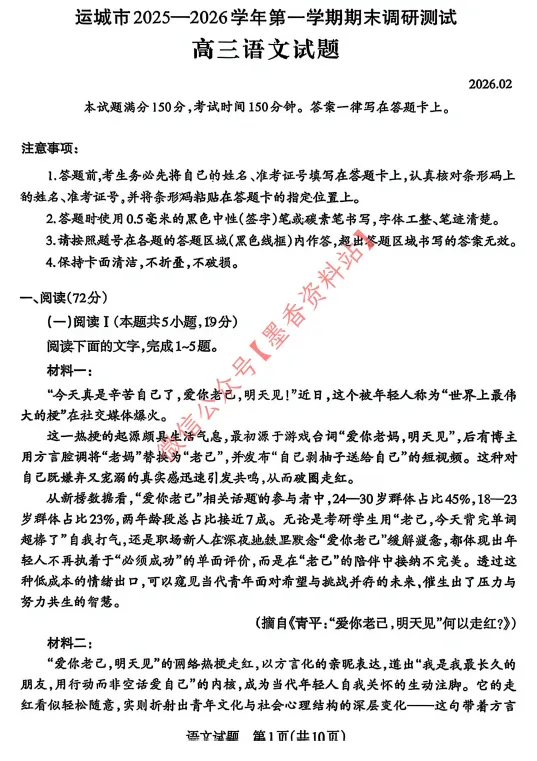 运城市2025-2026学年第一学期期末调研测试
