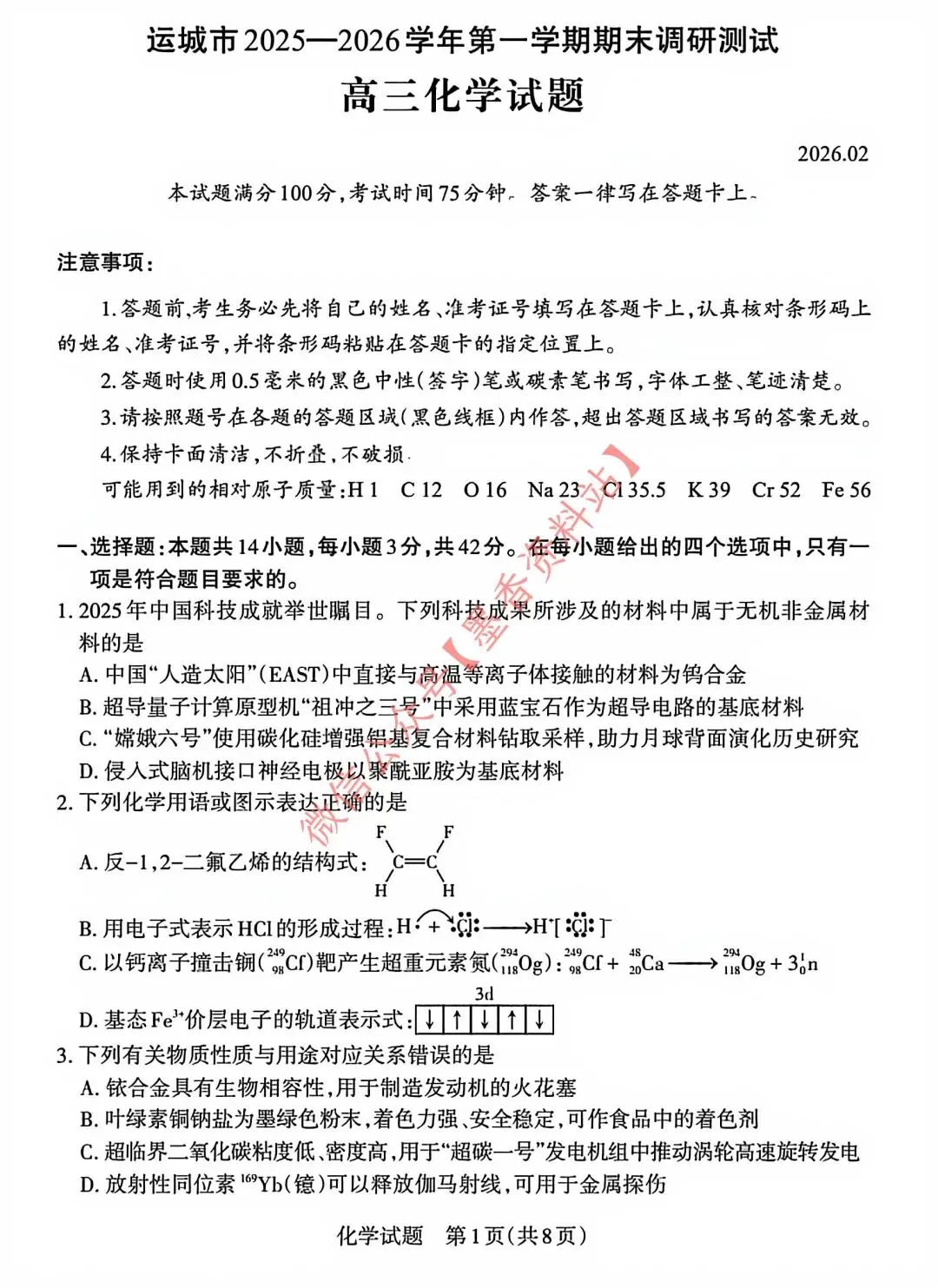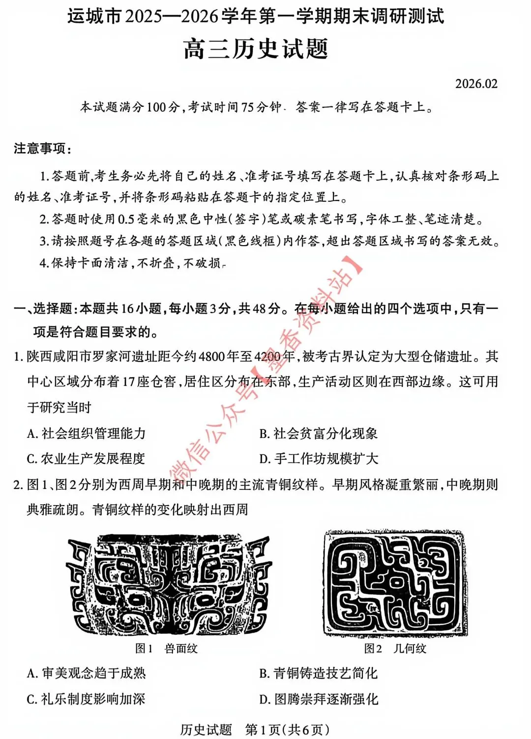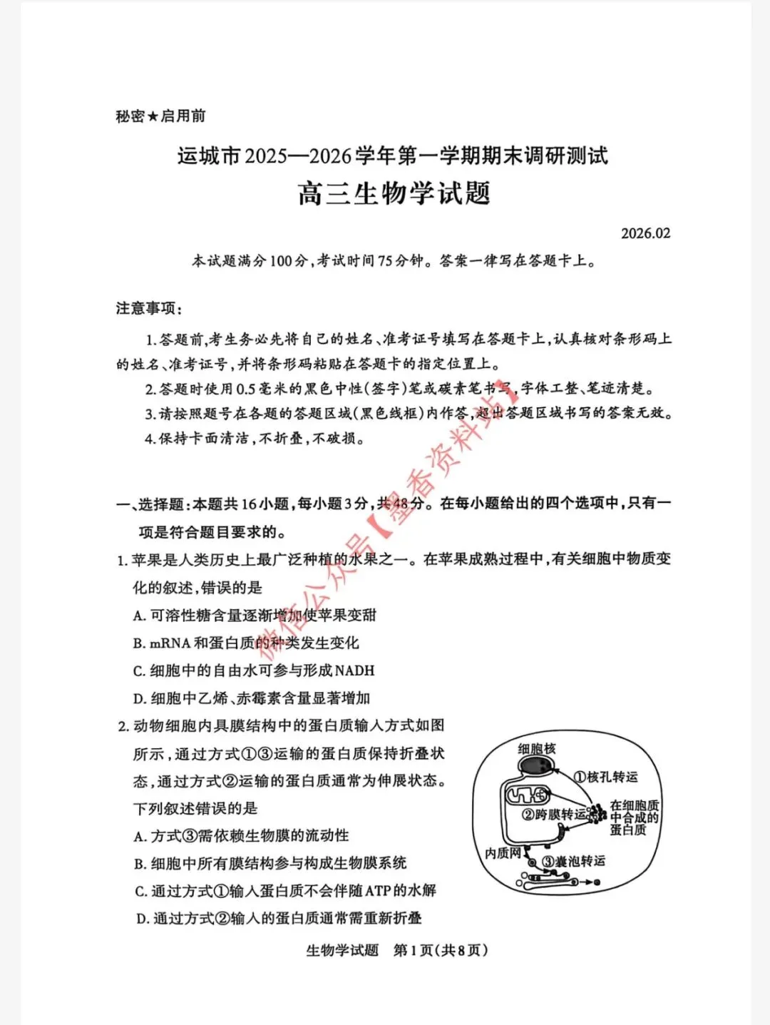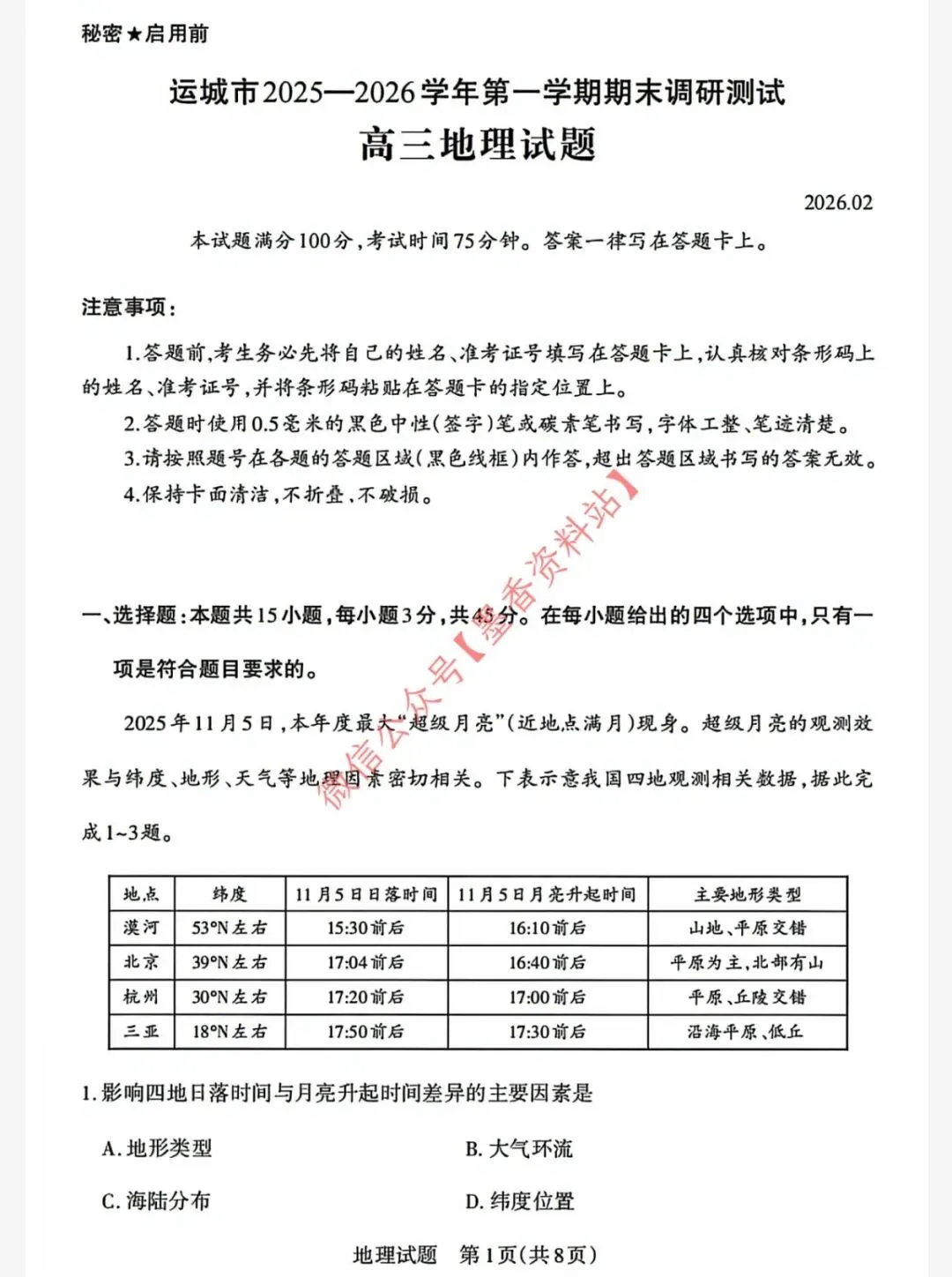 运城市2025-2026学年第一学期期末调研测试