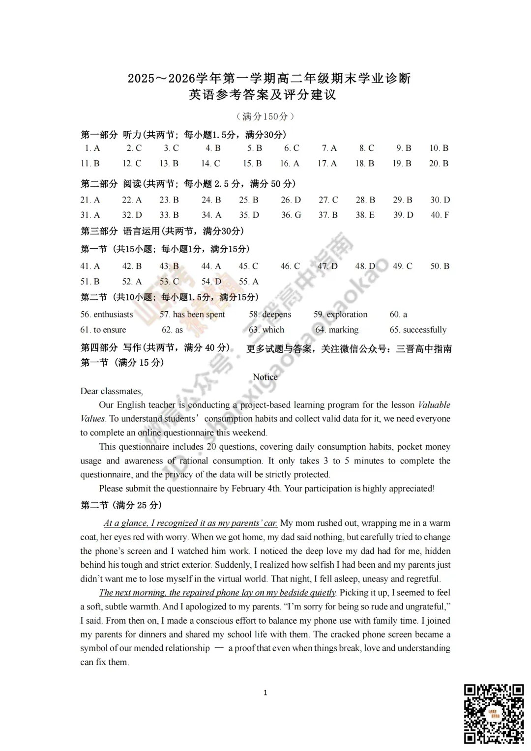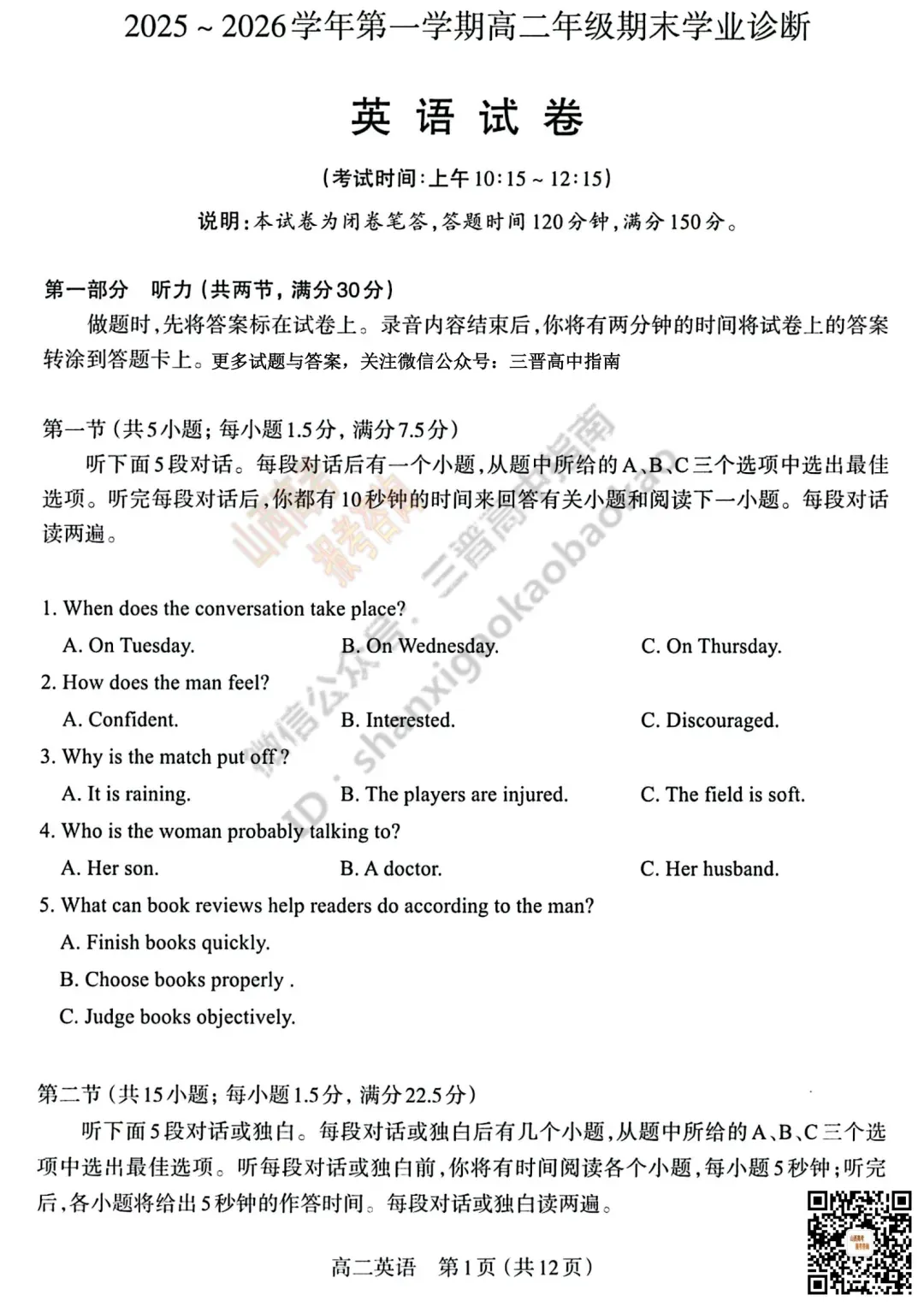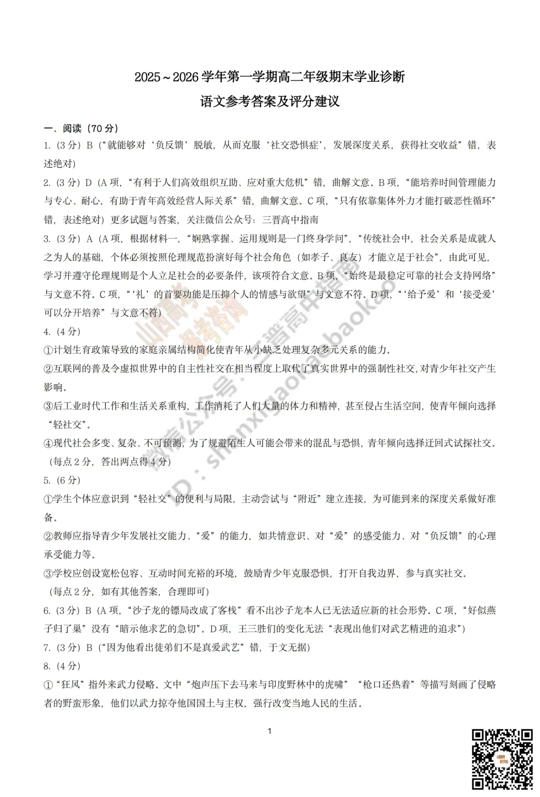 下文整理了太原市2026高二第一学期期末学业诊断全科试题与答案