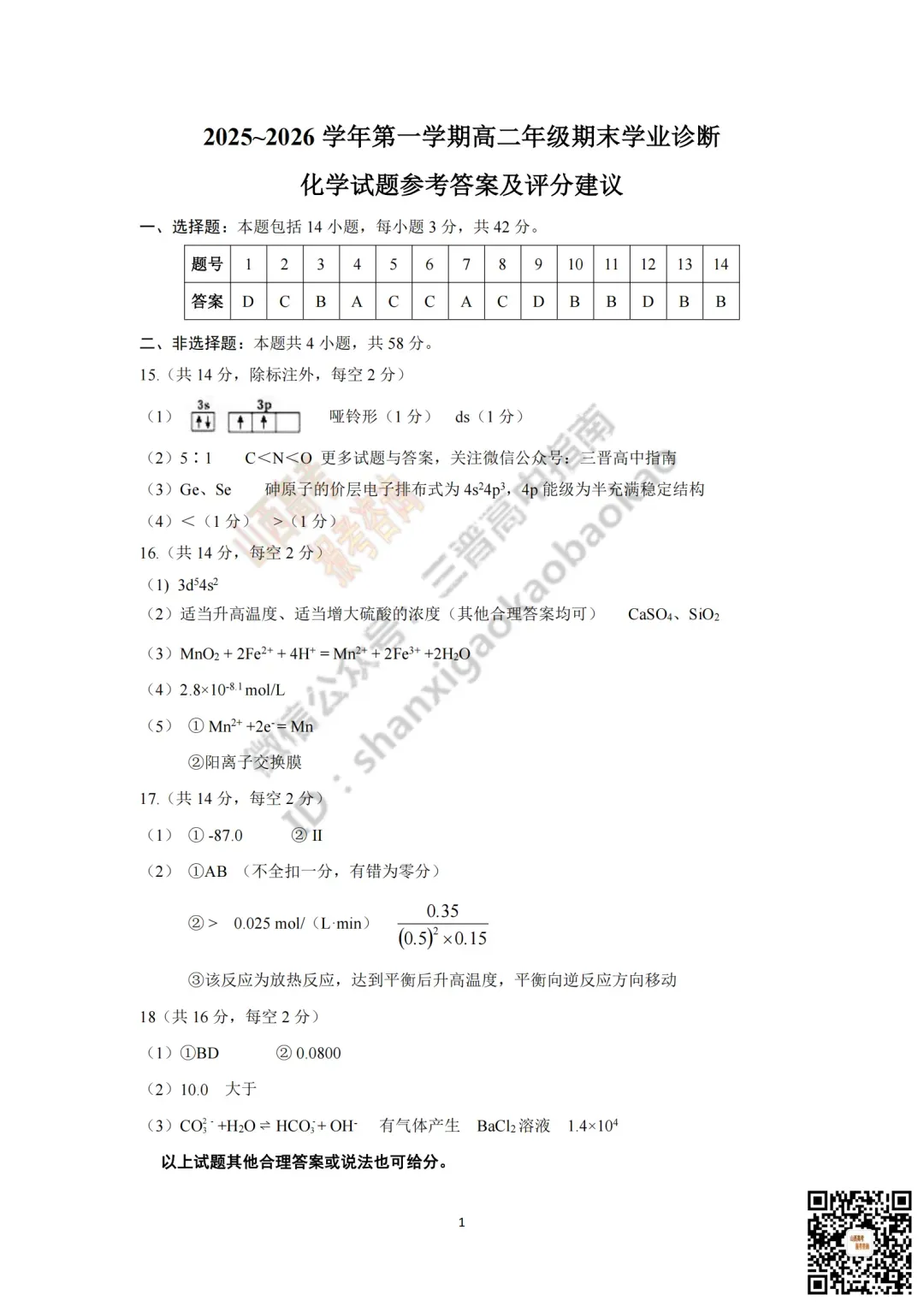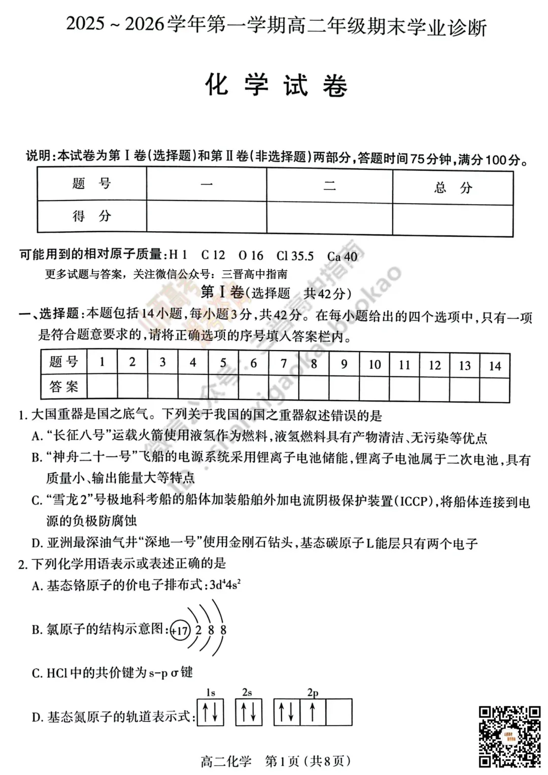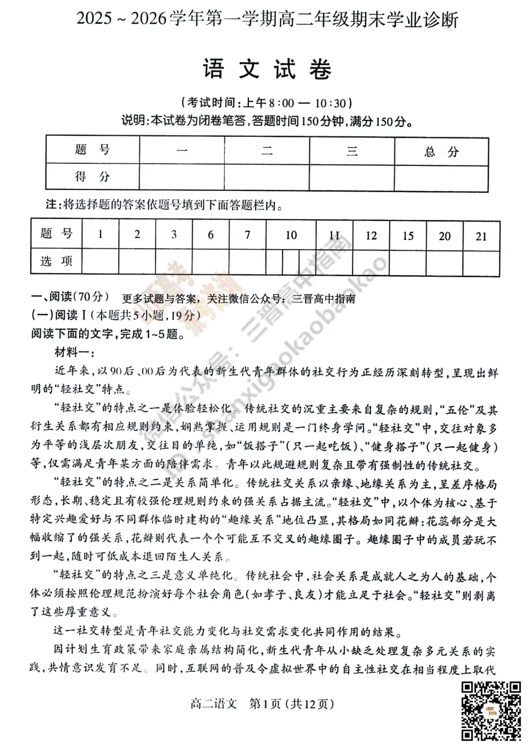 下文整理了太原市2026高二第一学期期末学业诊断全科试题与答案