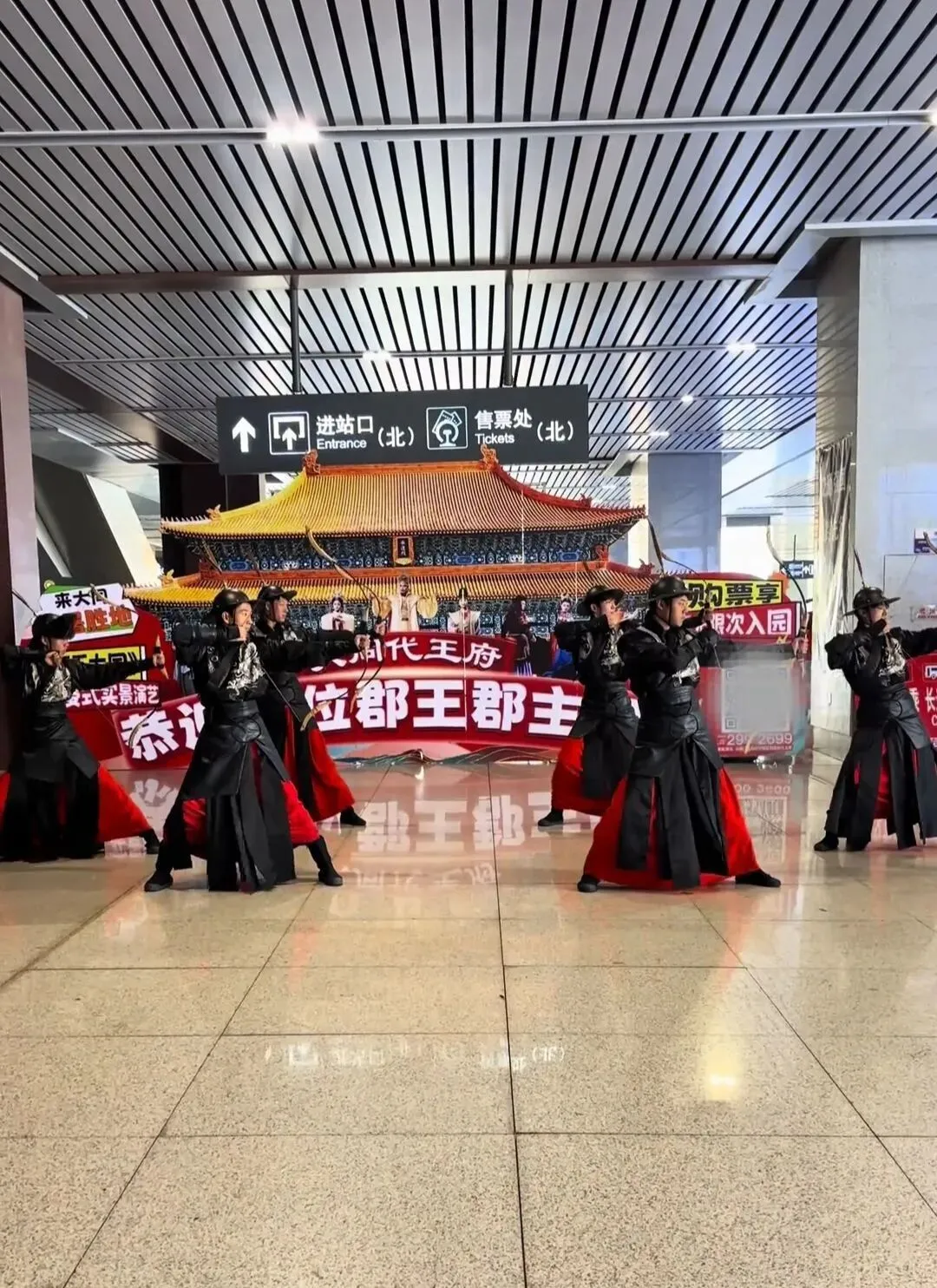 2月2日,据网友发布的视频显示,在山西大同南站,两排身着飞鱼服、腰佩绣春刀的“古代侍卫”在出站口列队迎宾,与游客互动合影。宫女手持宫灯跳起融合现代元素的古典舞,“代王”率众执礼相迎,引得旅客纷纷驻足惊呼:“这是穿越回大明了吗?”。道路尽头,“大同代王府欢迎各位郡王郡主回家”的标语,瞬间将返乡游子从现代交通枢纽拉入历史情境。