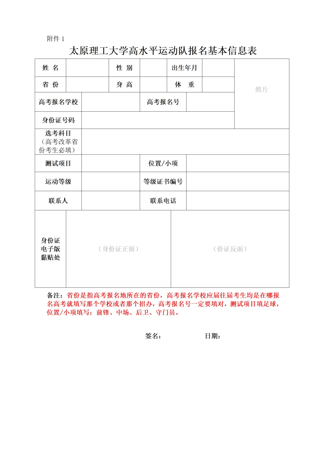 (1)《太原理工大学高水平运动队报名基本信息表》扫描件(附件1);