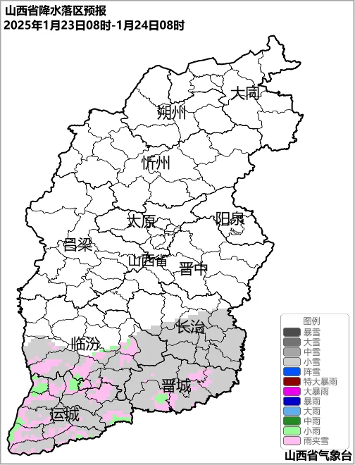 全省阴天,忻州及其以南大部分地区有小雪或雨夹雪,吕梁、临汾、运城、晋城等地的部分地区有中到大雪,局部大到暴雪。