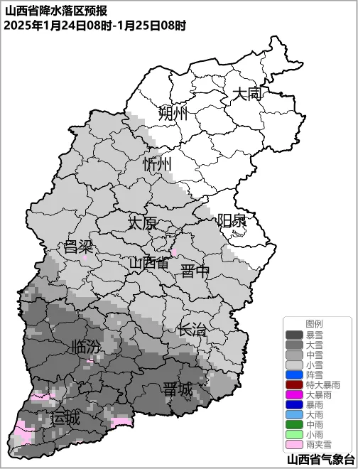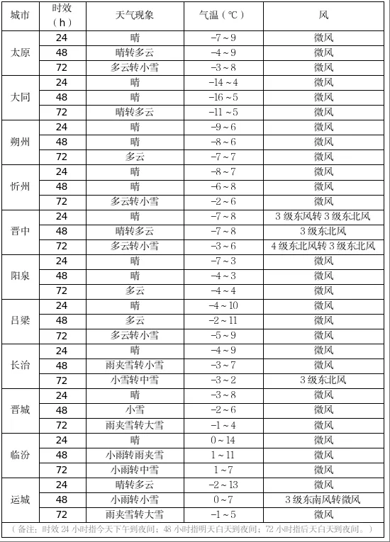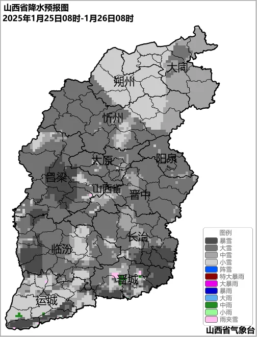 全省阴天,大部分地区有中到大雪,忻州西部、吕梁、晋中的局部和临汾、运城、长治、晋城的部分地区有暴雪。