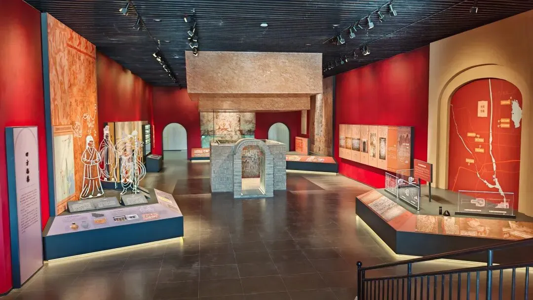 辽金元时期,大同作为西京,壁画墓题材进一步走向世俗化与多元化。本单元集中展示4座辽金元墓葬复原体,以许从赞夫妇墓、东风里辽墓、冯道真墓等为例,呈现出行、散乐、备茶、山水屏风等生活化题材。壁画中汉人、契丹人形象共存,胡风汉俗交融,体现了西京作为多民族交汇点的社会风貌。设计上采用“一墓一景”的阵列展示,配合图文解读,清晰勾勒辽金元壁画在唐宋变革中的承继与演变,凸显中华民族多元一体格局的生动写照。实景图