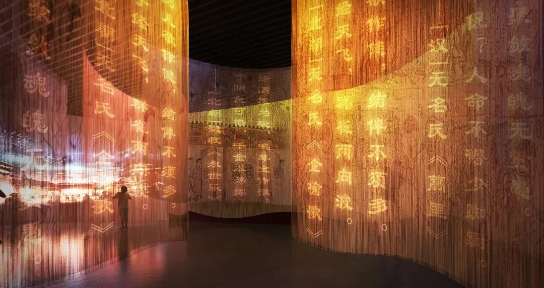 数字展厅以“千年相会”为主题,纱幕投影、弧幕动画、诗词互动,营造出如梦似幻的沉浸空间。以魏晋人与鬼相会的故事作为引子。采用壁画所绘,古人去世后带着依仗车队,浩荡出行,与家人、亲人会面宴饮。观众穿行于光影之间,与壁画人物“同席共饮”,感受北魏人的日常与精神世界。