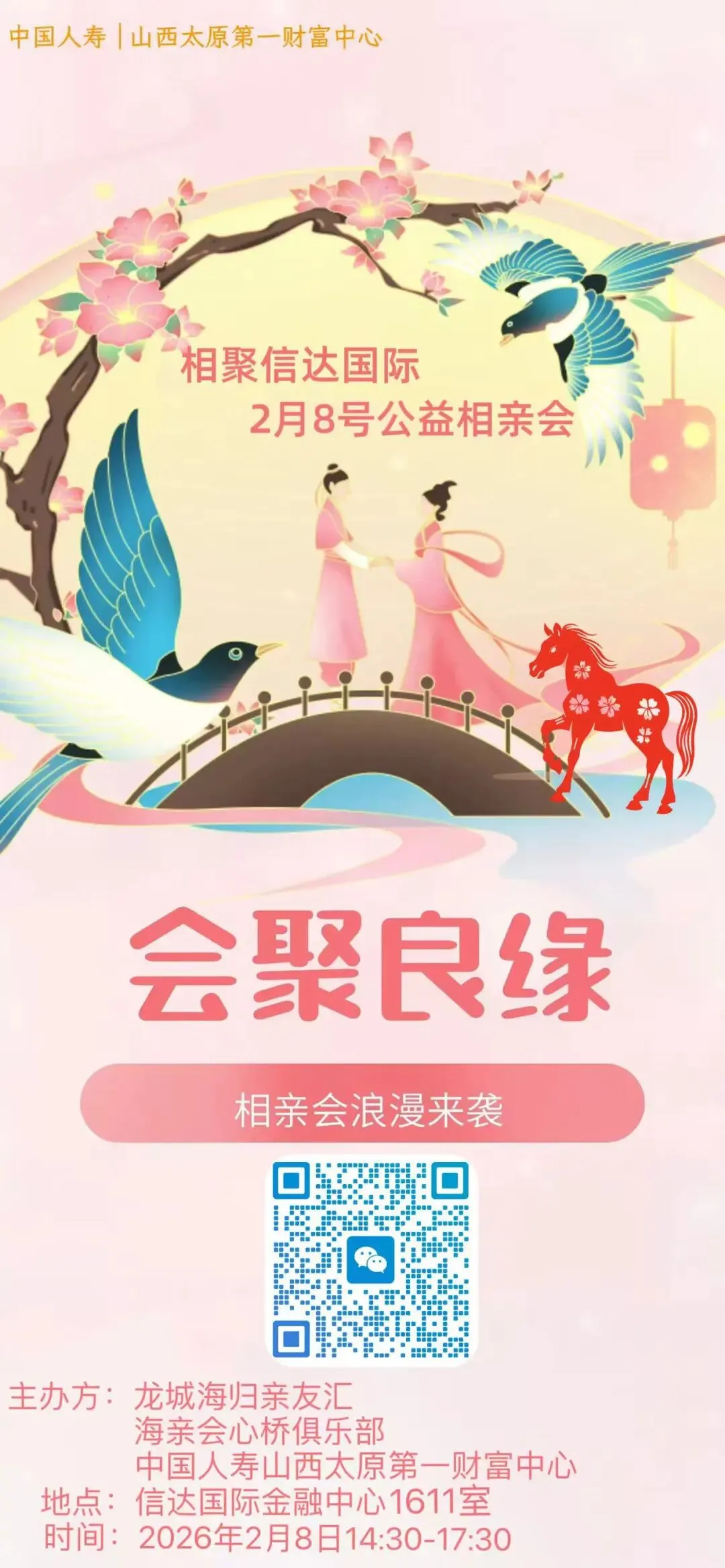 为了解决在太原工作生活的优秀青年婚恋问题,龙城海归亲友汇&中国人寿山西太原第一财富中心,定于2026年2月8日(周日)举办一场公益相亲联谊活动(本次活动属于公益活动,不收取任何费用)。已开始报名啦!