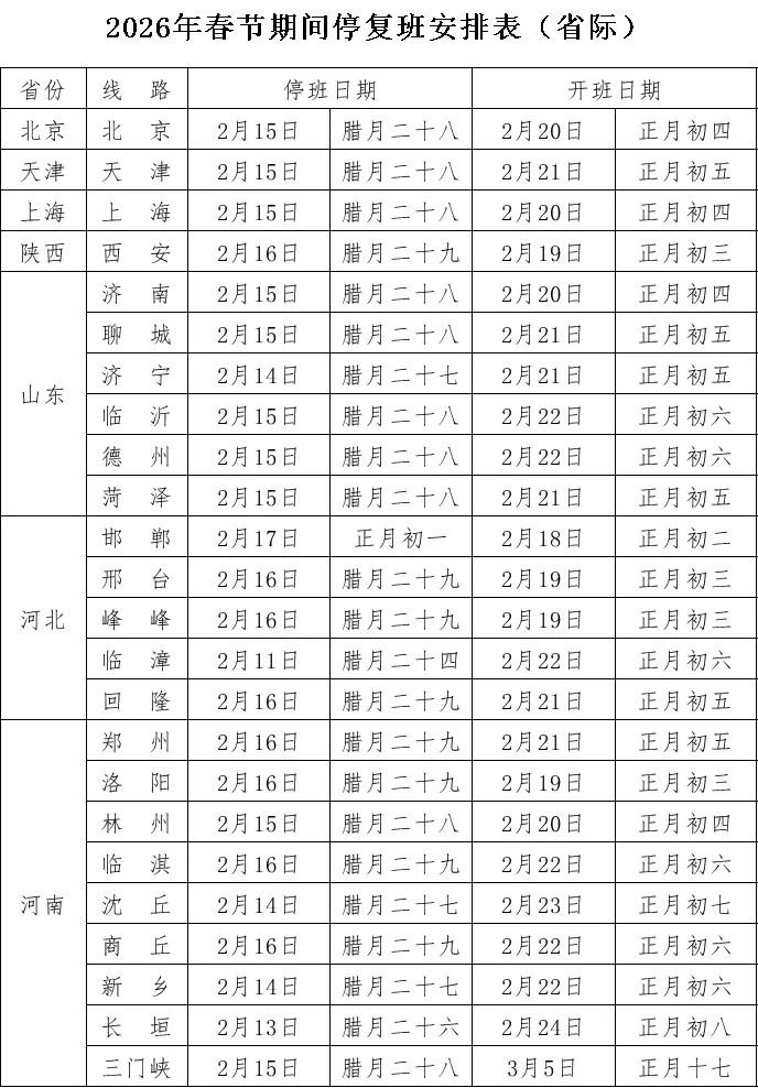 2026年春节期间停复班安排表