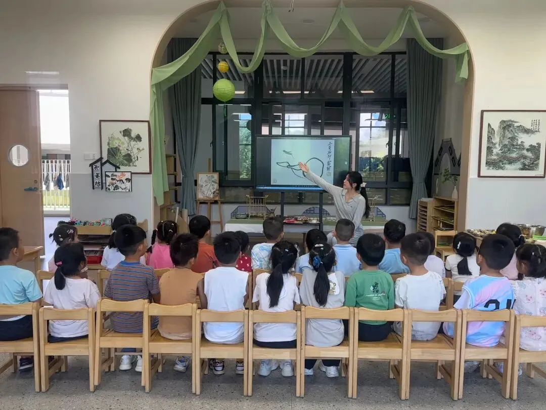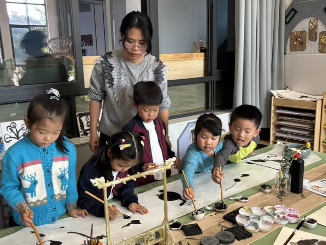 结合《3-6岁儿童学习与发展指南》艺术领域中“感受与欣赏”及“表现与创造”的核心目标,以文化浸润与游戏探索为路径,支持幼儿全面发展。从初识“文房四宝”与名画开始,孩子们在活动中探索水墨的千变万化;进而学习简单笔法,创作点线抽象画;最后围绕“江南”、“瓜果”等主题进行完整创作,体验墨与色的交融,尽情表达心中童趣。