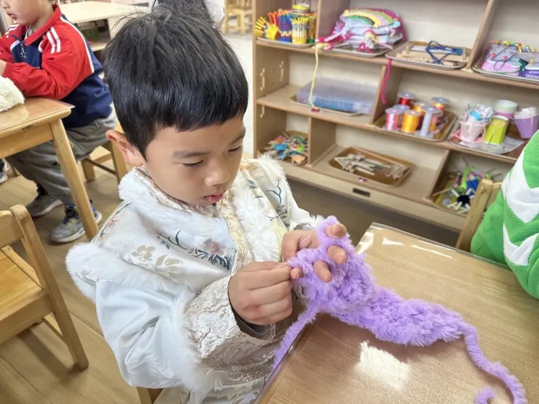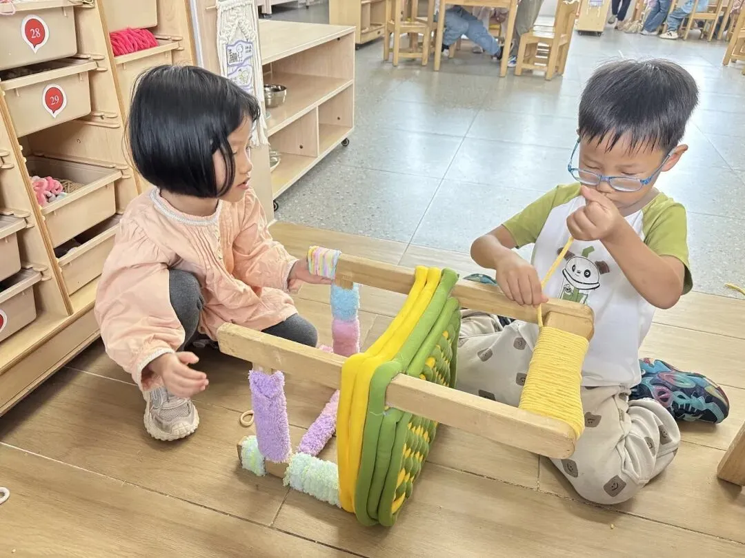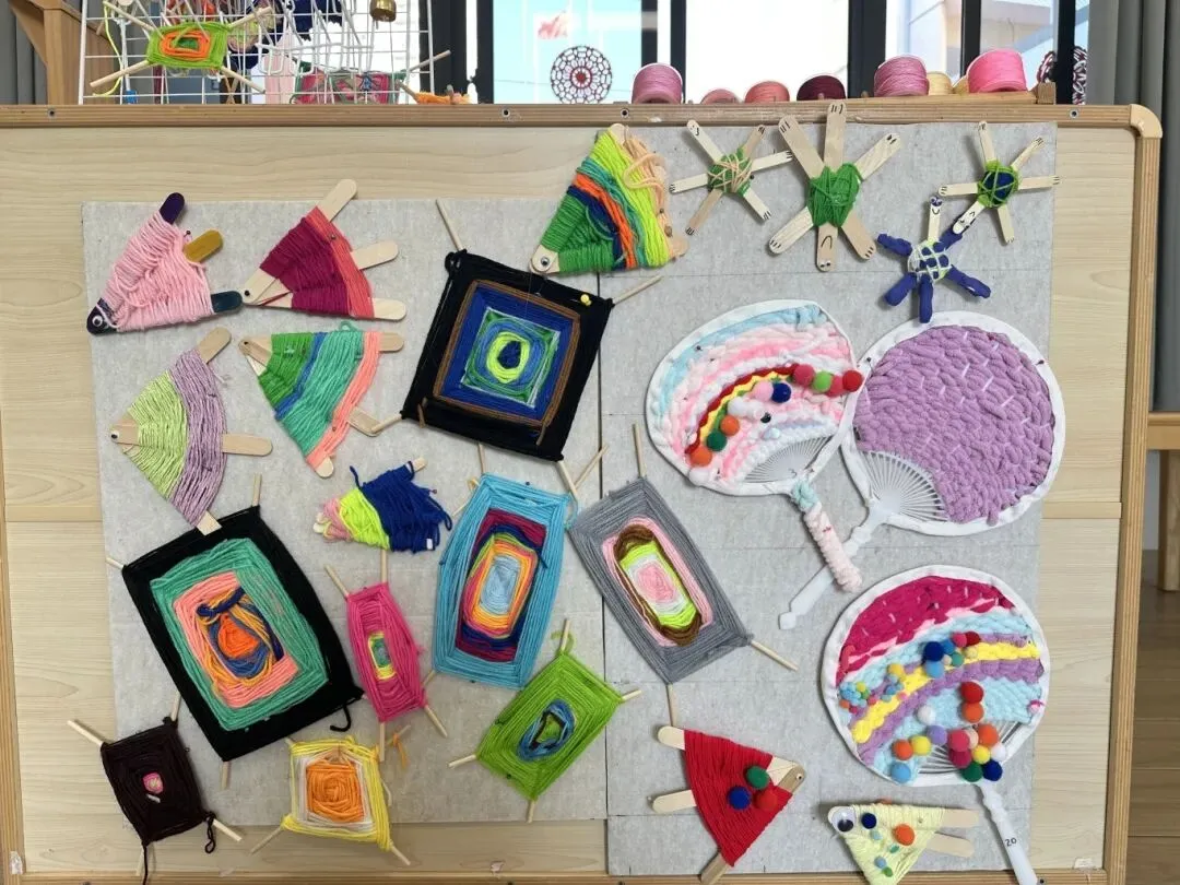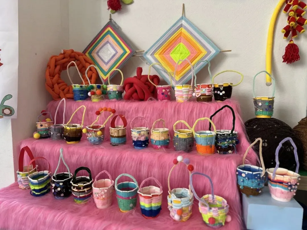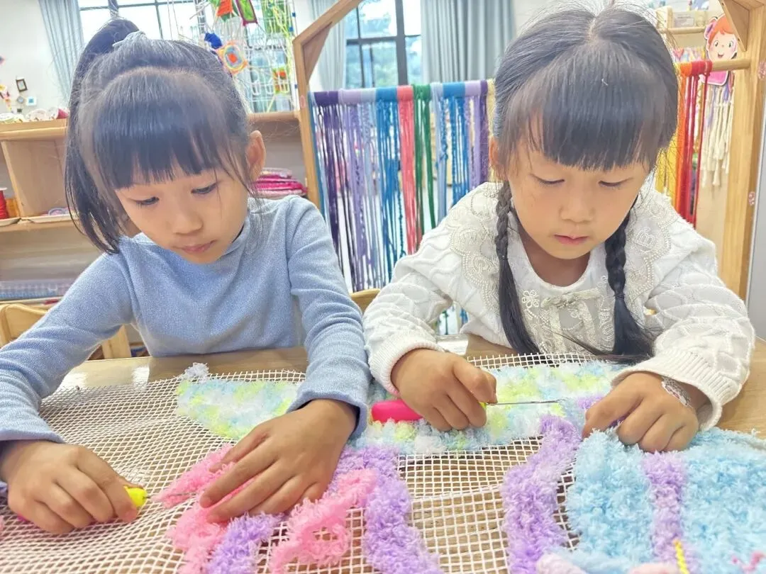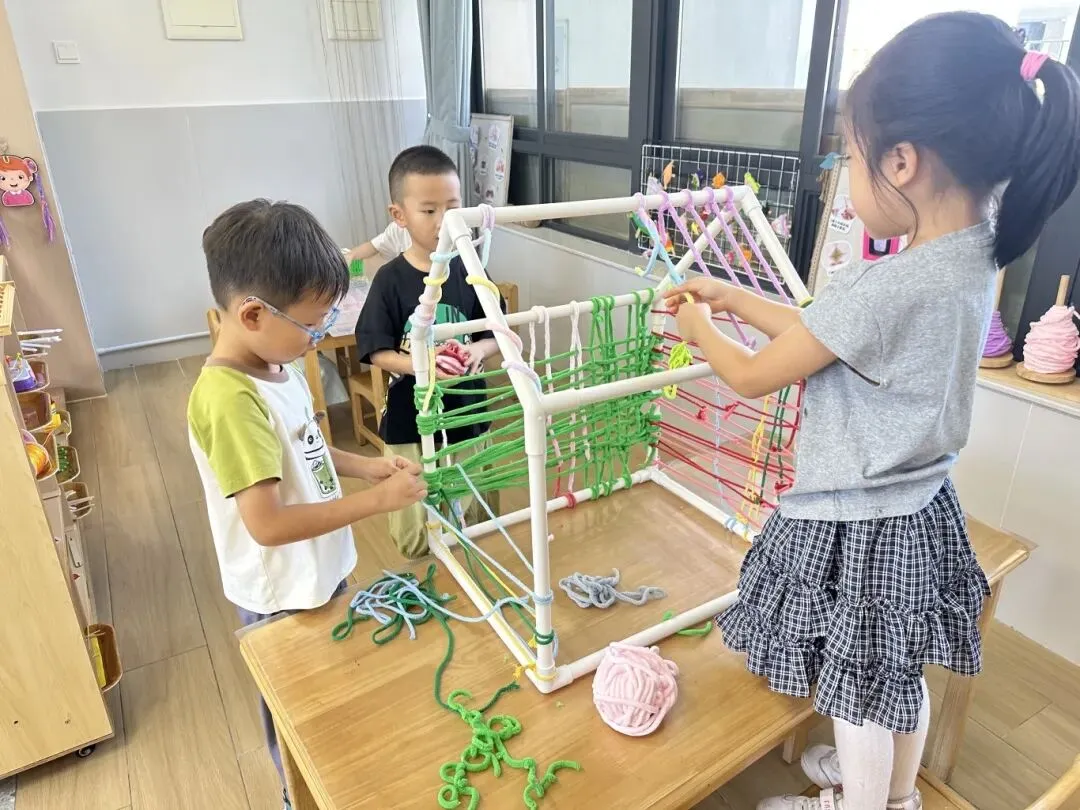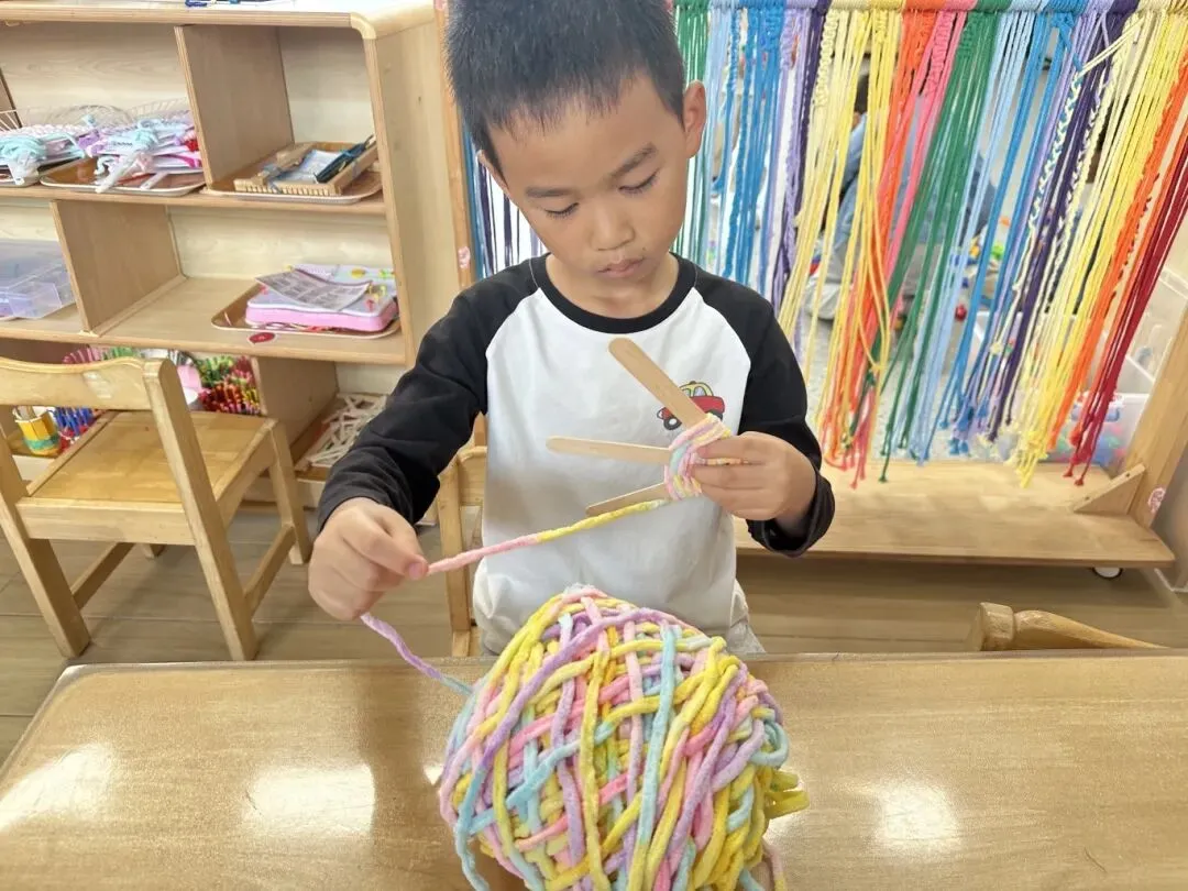 编织活动的整个过程以幼儿的实际操作和亲身体验为核心,孩子们在专注走线、耐心调整、尝试创新的过程中,手部精细动作与手眼协调能力得到针对性锻炼;在遵循步骤完成编织、解决线结松散、图案不规整等小问题时,培养了细心专注、坚持不懈的良好品质;在小组幼儿合作完成集体编织作品时,学会了沟通配合、互帮互助,进一步发展了合作意识与社交能力;同时,在自主选择毛线颜色、设计编织纹路的过程中,创造力与审美感知也得以自然萌发。每一次尝试、每一次调整,都是幼儿主动获取经验、提升综合能力的生动过程。