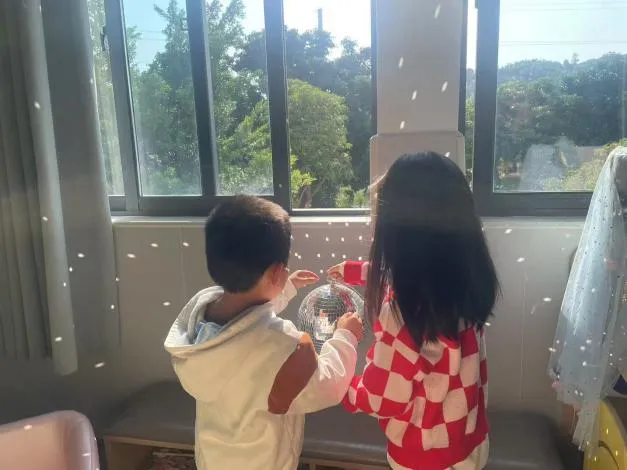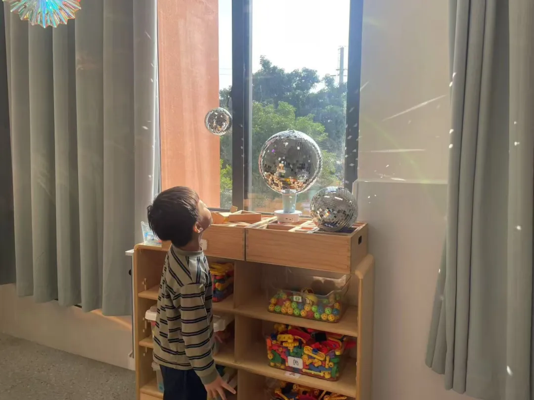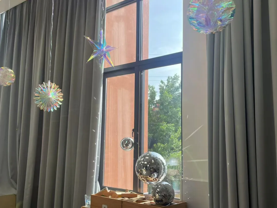 课程的每一步,都追随着孩子们眼中光的方向。在环境共创中,他们成为美好空间的营造师:他们踮起脚尖,和老师一起悬挂起星星点点的光影球;每天午后,最期待的仪式便是共同拉开窗帘,迎接阳光涌入,将教室变成一片温暖、明亮的光之海洋。光影,因他们的参与,从现象变成了日常的浪漫。