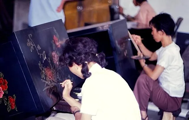 这个黑亮的柜子边上,姑娘拿细笔勾花,红牡丹一瓣一瓣地起层次,漆面照人,师傅在一旁打底色,妈妈说“这玩意儿怕磕”,搬家时都拿旧毛毯裹着,现在成陈列品了,放屋里立马就有腔调。