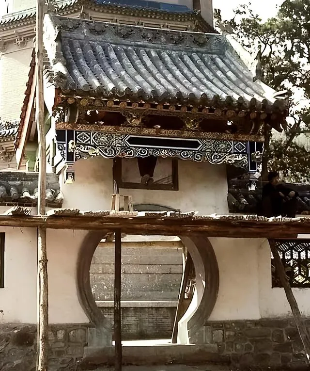 这堵白墙开着个月亮门,脚手架木杆子搭得密,师傅站在檐下修花饰,袖口全是灰,太阳往墙上一照,门洞像一只扣在地上的玉镯子,现在安全帽反光背心一套齐,活还是那活,规矩更细了。