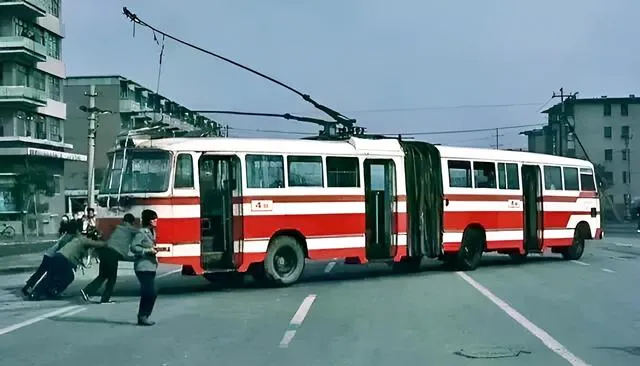 这辆红白相间的是4路无轨电车,起凤街到五一东街那条线,照片里车好像犯了懒,几位师傅上手就推,车轮慢慢挪动,旁边有人招呼“再来点劲”,这画面太原人都懂,现在遇到抛锚,一键呼叫救援,热乎劲儿却少了些。