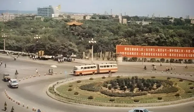 这张里的环形花坛在大南门,公交车绕着跑一圈,标语牌红艳艳的,路边站着的人不慌不忙,后来花坛拆了,地铁通了,速度上来了,老地标就成了照片里的一页。