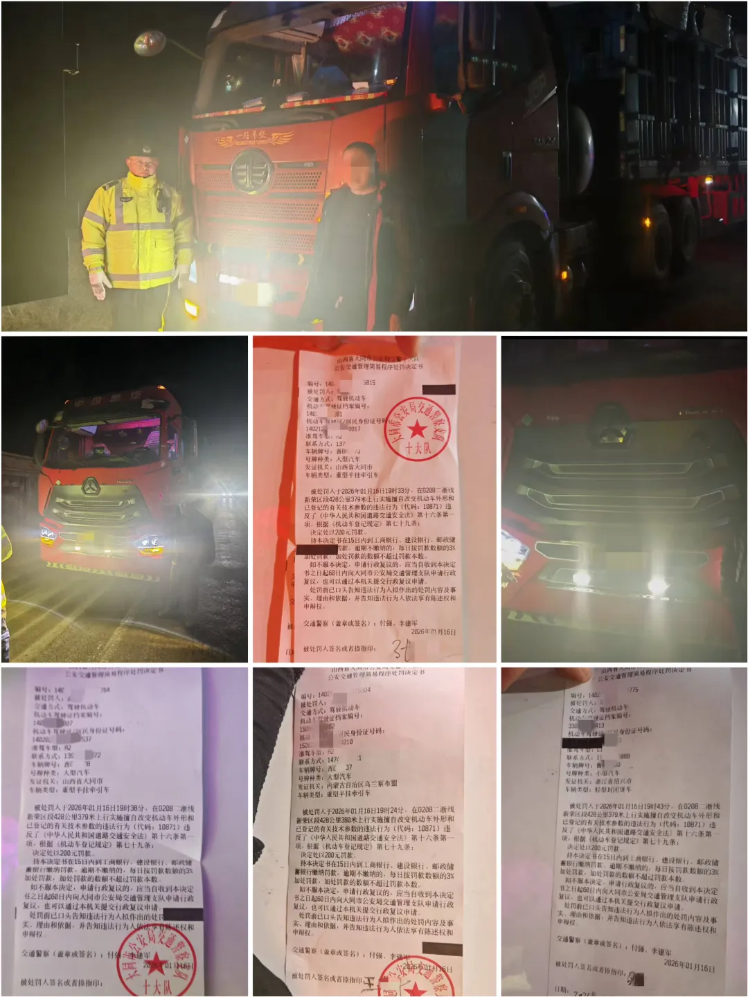 近日,在省道201线(马走线)焦庄村弯道路段,发生一起因雪天违法行车、事故后应急处置失当引发的连环交通事故。驾驶人白某驾驶小型轿车从太原市驶往河北省蔚县,行驶至省道201线(马走线)焦庄村弯道路段时,无视雪天路面湿滑的危险状况,超速行驶导致车辆侧滑,与路侧树木相撞,造成单方交通事故。事故发生后,白某既未及时报警,也未按规定在来车方向设置警示标志、迅速撤离至安全区域,仅开启车辆双闪警示灯后便站在路旁联系清障车辆,放任危险隐患持续存在。单方事故发生31分钟后,驾驶人沈某某驾驶重型半挂车沿同一路段由南向北行驶至该弯道处时,同样未对雪天路况采取降速、控距等防范措施,因车速过快,发现前方情况时避让不及,先后碰撞白某的轿车、路边的白某,以及同向前方行驶的半挂车后部。最终,这起连环事故造成白某当场死亡,三方车辆不同程度损坏的严重后果。大同公安交管部门提示:冬季全市降雪等恶劣天气多发,驾车出行务必严格遵守交通法规,遇湿滑、弯道路段提前降速、保持安全车距;一旦发生交通事故,牢记“车靠边、人撤离、即报警”三大要点,切勿在事故现场逗留,切实筑牢自身和他人的生命安全防线。2026年1月5日晚,大同市公安局交通管理支队支队领导在夜查巡视中在迎宾街消防岗发现一辆金杯面包车涉嫌非法接送学生上下学,随即上前依法进行检查并指令交管三大队进行核查处理。经民警现场检查确认,该车辆核载9人、实载10人,存在超员违法行为;同时,该车私自加装2个座椅,属于擅自改变机动车已登记的有关技术参数的违规情形,执勤交警当即依法将涉案车辆查扣。经进一步调查核实,该车自2025年9月起,在未取得校车标牌的情况下,以盈利为目的非法从事学生接送业务。根据以上违法情形,按照《中华人民共和国道路交通安全法》和《校车安全管理条例》相关规定,依法对驾驶人未取得校车标牌的车辆提供校车服务的违法行为,罚款10000元、没收违法所得10800元;对驾驶人擅自改变机动车外形和已登记的有关技术参数的违法行为,罚款200元;对驾驶人驾驶营运车辆以外的载客汽车超过核定人数未达到20%的违法行为,罚款200元、记6分的行政处罚。1月21日13时45分许,大同市公安局交通管理支队交管五大队巡逻民警在辖区路段开展日常巡查时,发现一辆面包车行驶轨迹异常,沿途多次停靠并搭载多名学生,存在非法提供校车服务的嫌疑。民警立即示意该车靠边停车接受检查。经核查,驾驶人安某未取得校车驾驶资格,其驾驶的车辆也未办理校车运营许可及校车标牌,属于典型的“黑校车”违法运营行为,安某对其违法事实供认不讳。根据《中华人民共和国道路交通安全法》和《校车安全管理条例》相关规定,交管五大队依法对涉事车辆予以暂扣,并对安某使用未取得校车标牌的车辆提供校车服务的违法行为,作出罚款10000元行政处罚。1 月 23 日中午,大同市公安局交通管理支队交管三大队执勤民警在大同三中周边现场拦截一辆涉嫌非法接送学生的车辆。经调查核实,该车为某教育机构所有,负责人丰某某在未取得校车标牌的情况下,擅自使用该车为学生提供接送服务,其对非法营运的违法事实供认不讳。同时该车辆还存在擅自改变机动车外形及已登记技术参数的违法行为。依据《中华人民共和国道路交通安全法》和《校车安全管理条例》相关规定,大同市公安局交通管理支队交管三大队对丰某某 “使用未取得校车标牌的车辆提供校车服务” 与 “擅自改变机动车外形和已登记技术参数” 两项违法行为,依法作出合并执行罚款10200元的行政处罚。大同公安交管部门提示:“黑校车”未在教育、交通、公安等部门备案,日常运营完全处于监管盲区,无法对其进行定期安全检查和动态监控。一旦发生安全事故,运营者往往选择逃逸或无力赔偿,受害儿童家庭难以获得及时、足额的医疗和经济补偿。驾驶员通常没有校车驾驶资格,缺乏应急处置和儿童安全照管的专业能力。广大学生家长一定要提高安全意识,切勿让学生乘坐没纳入监管的“黑校车”,如果发现使用非法车辆接送学生,请及时向有关部门举报。2026年1月15日上午,左云县公安局交管大队鹊儿山中队在109国道云西丁字路口附近设置临时检查点,查获一起大货车非法改装车灯违法行为。依据《中华人民共和国道路交通安全法》相关规定,民警当场对驾驶人进行交通安全教育,告知其非法改装车灯的多重危害,责令驾驶人现场拆除非法加装的灯具、恢复车辆原厂灯光配置,并依法作出罚款200元的行政处罚。2026年1月16日晚,大同市公安局交通管理支队七大队在辖区208国道查获四起货车非法改装车灯违法行为。经询问,驾驶人皆为图夜间行车视线更清晰,擅自对车辆灯光系统进行改装。依据相关法律法规,民警现场责令驾驶人拆除改装灯光,恢复车辆原厂配置,并对四名违法驾驶人分别作出罚款200元的处罚。近日,大同市公安局交通管理支队八大队在辖区货车流量较大路段设置检查点,对过往货运车辆安装大功率 LED 射灯、激光排灯等非法加装设备进行排查,共查获相关违法行为 35 起。民警对违法驾驶人进行安全教育的同时,监督驾驶人现场拆除非法装置,并依法分别予以200元的行政处罚。大同公安交管部门提示:货车私自加装强光灯,夜间会车时易造成对向车辆驾驶人瞬间 “致盲