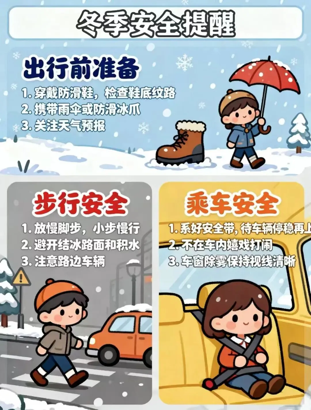 1.  冬季气温走低,同学们要及时增添衣物,佩戴好手套、帽子等保暖用品,做好防寒措施,避免冻伤和感冒;雨雪天气后,路面易积雪、结冰,切勿在结冰路面追逐打闹、嬉戏滑行,防止滑倒摔伤。