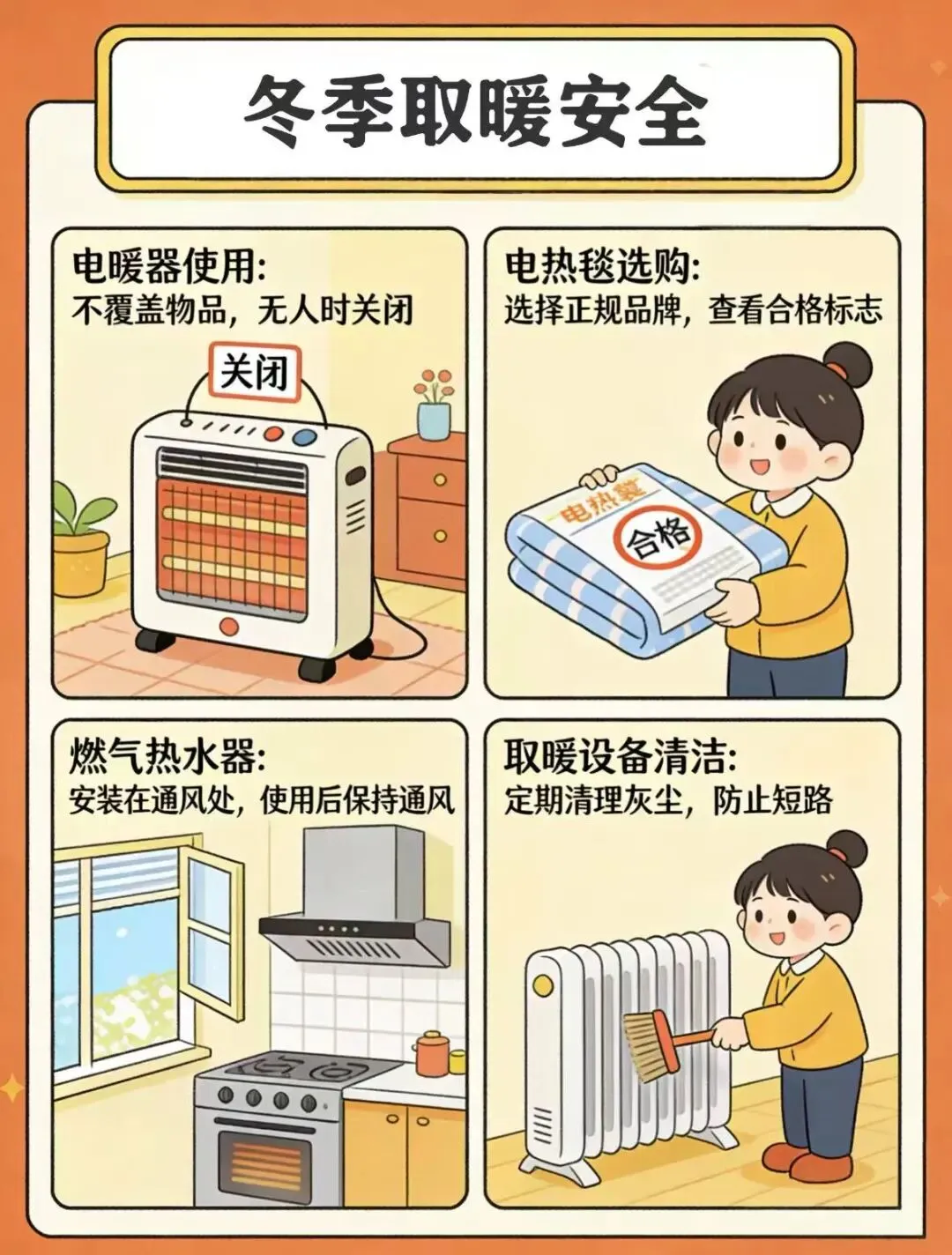 1.  使用电取暖设备时,需通过正规渠道选购合格产品,严格按照使用说明操作,使用期间与窗帘、被褥等可燃物保持安全距离。