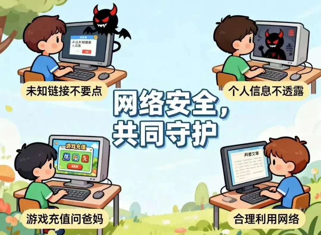 3.  提高网络防骗意识,不点击未知链接、不轻信陌生来电、不泄露个人及家庭信息、不随意向陌生人转账;警惕“冒充公检法”“免费游戏皮肤”“加明星QQ”“刷单返利”等常见诈骗手段,遇可疑情况第一时间告知家长或报警。