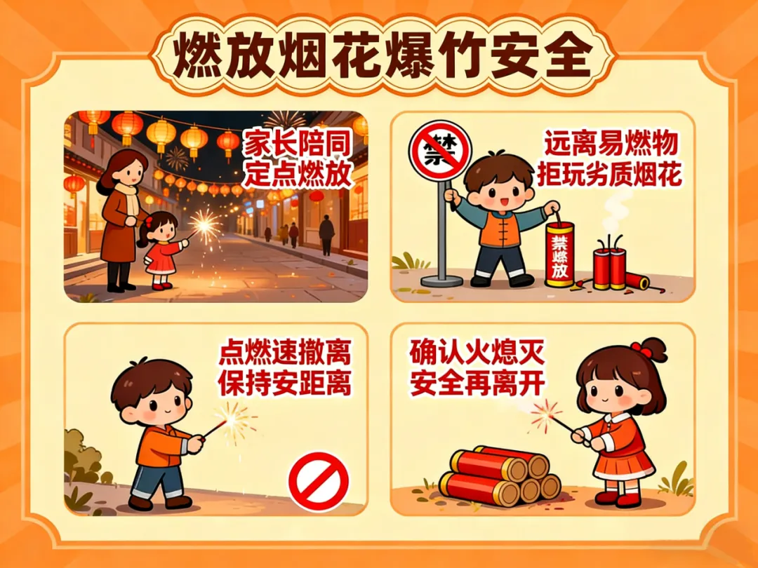2. 严禁孩子单独燃放,需由家长全程陪同指导;不购买“三无”烟花爆竹,燃放时不向人群、车辆、化粪池等危险区域投掷。