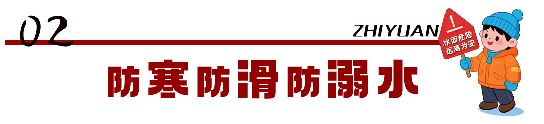 1. 及时提醒孩子增添衣物、佩戴保暖用品,预防感冒冻伤;不在积雪、结冰路面嬉戏追逐,避免滑倒摔伤。