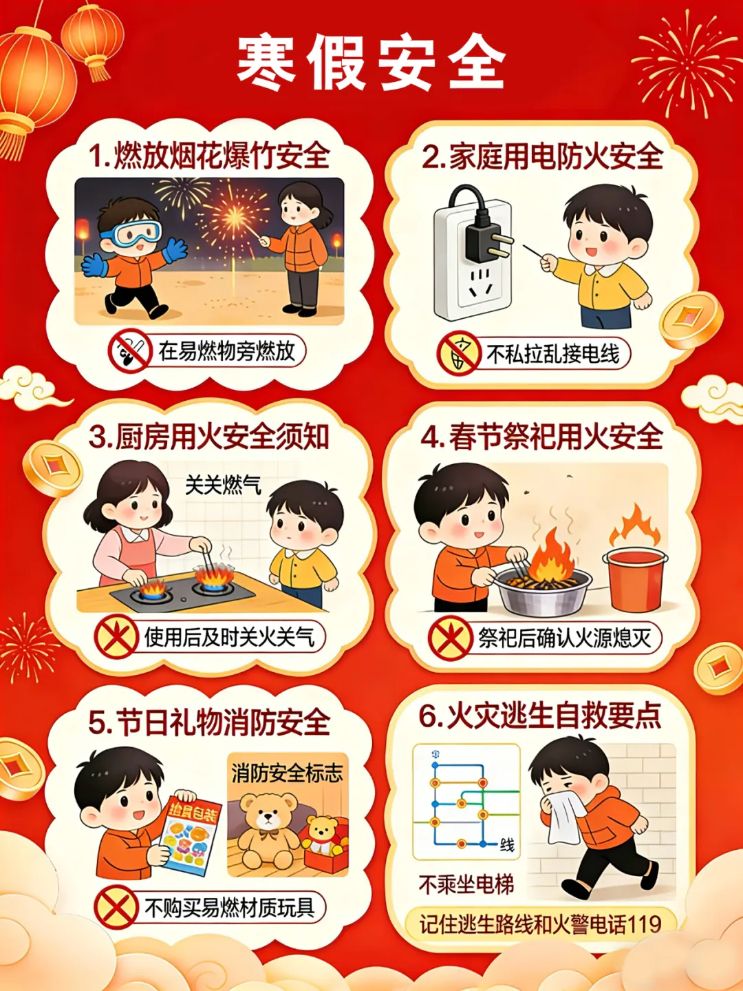 1. 禁止孩子玩火,妥善保管易燃易爆物品;严格落实“三清三关”(清阳台/走道/厨房,关火/电/气)。