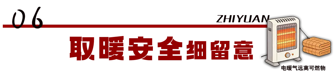1. 电暖设备远离可燃物,不覆盖烘烤衣物,出门或睡前及时断电。