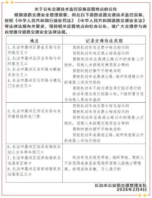 长治潞州区新增8处电警,位置在…