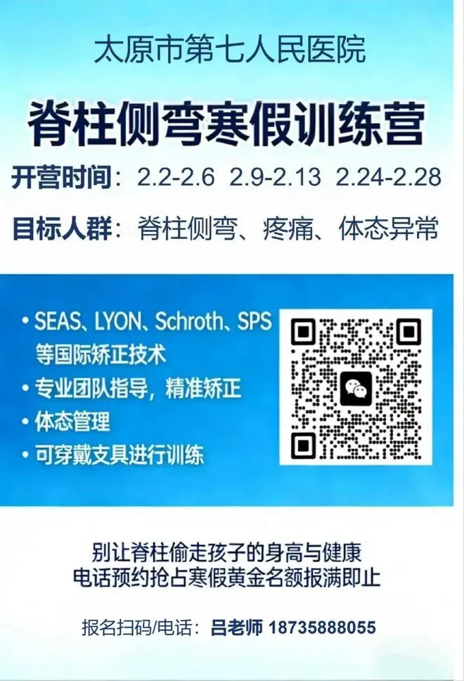 针对青少年 “懒骨头体态”、脊柱侧弯及各类不良体态问题,太原市第七人民医院脊柱侧弯诊疗室寒假康复训练营现已全面启动!作为国家级 “知脊少年百城计划” 培训单元、意大利 SEAS 疗法认证实践基地,医院依托专业诊疗实力,为孩子打造科学高效的康复方案: