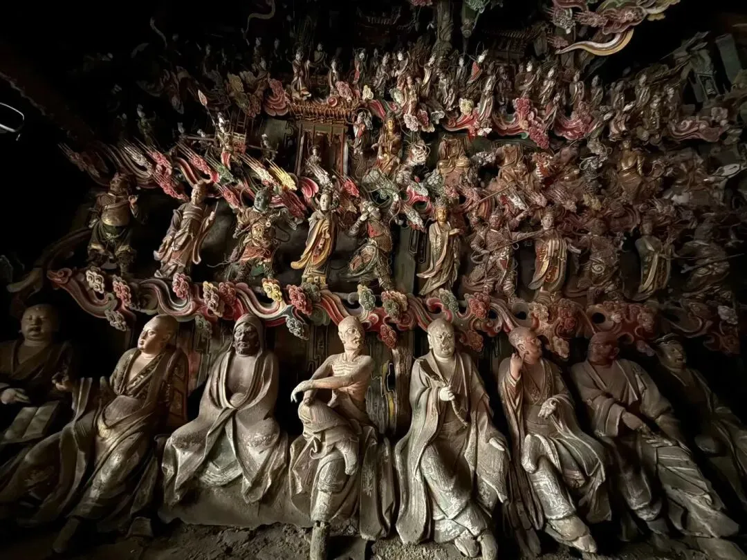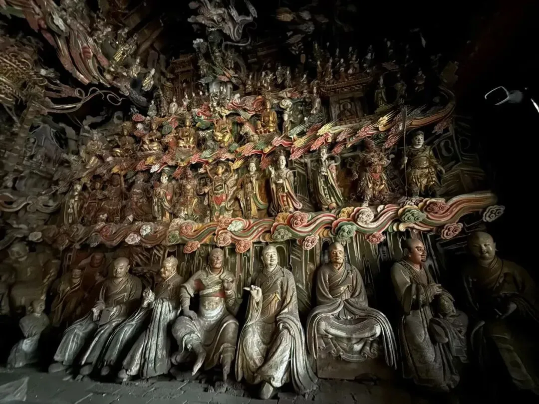 小小的三间殿堂之内,现存约五百尊塑像,彩塑、悬塑相间,儒、释、道三教共融,可谓明代彩塑中的精品。