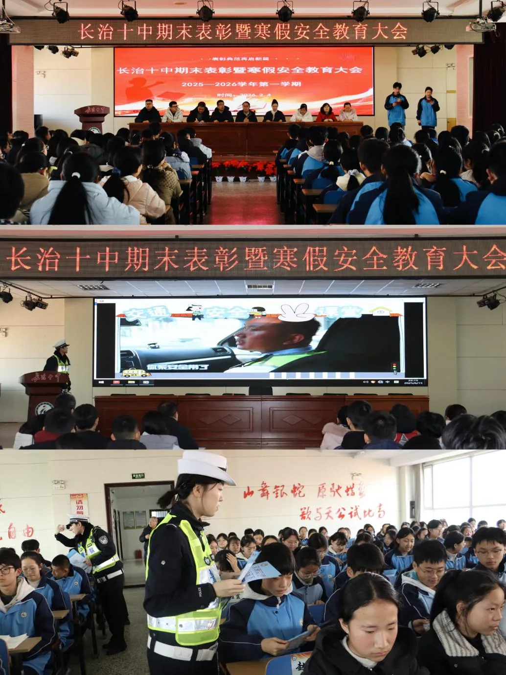2月4日上午,学校召开全校学生期末总结表彰暨安全教育大会,将安全部署延伸至每一位同学,实现校园安全教育全员无死角覆盖。会议在总结学期成果、表彰优秀学子的同时,围绕寒假安全重点内容展开专题宣讲,特别邀请交警一大队民警莅临现场,结合典型交通案例,为全体学生开展交通安全知识专题讲解,直观普及出行规则与避险常识。