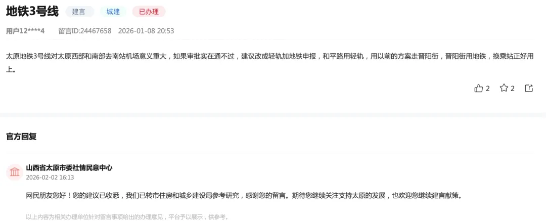 >太原市民建议:3号线用“轻轨+地铁”!官方回复~