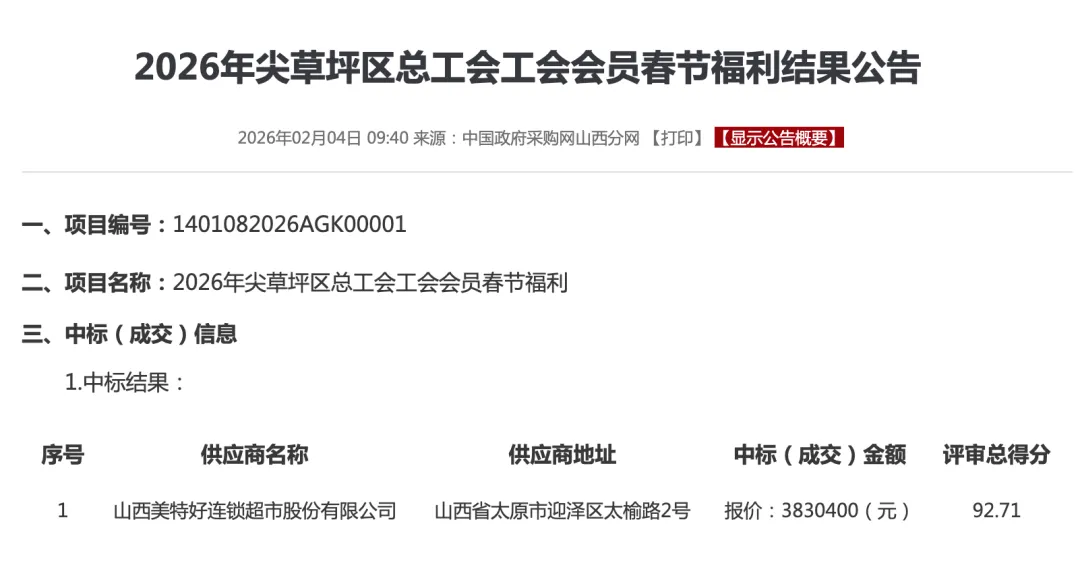 026年2月4-5日,山西美特好连锁超市股份有限公司接连中标太原尖草坪区总工会、万柏林区总工会、