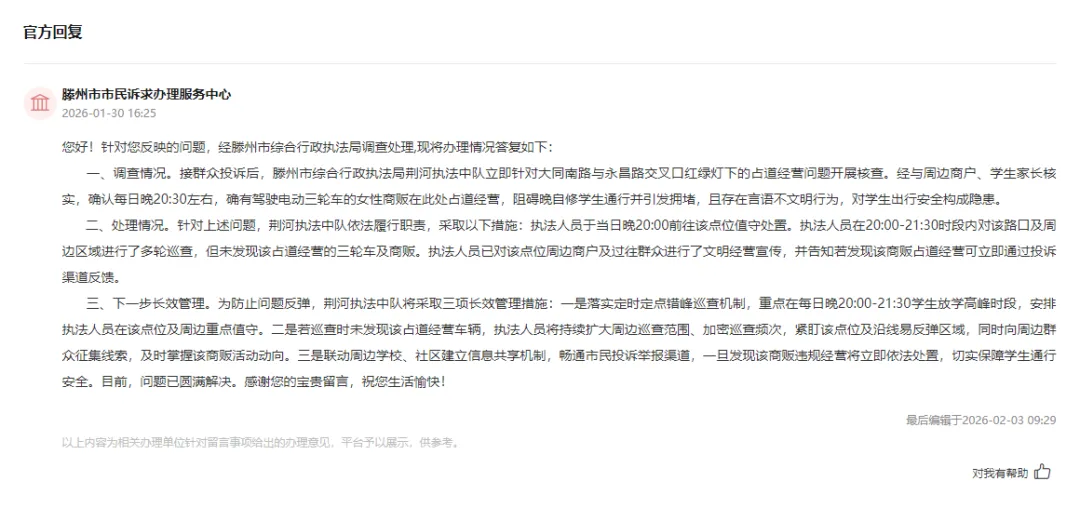 三是联动周边学校、社区建立信息共享机制,畅通市民投诉举报渠道,一旦发现该商贩违规经营将立即依法处置,切实保障学生通行安全。