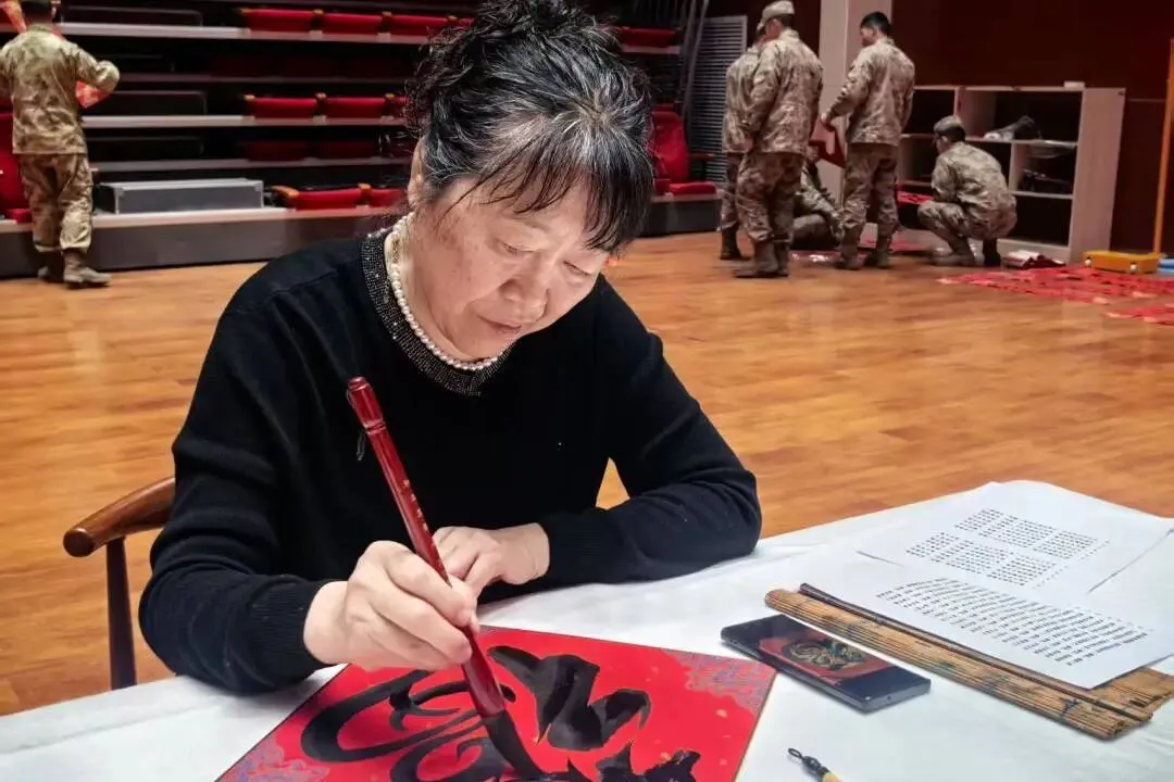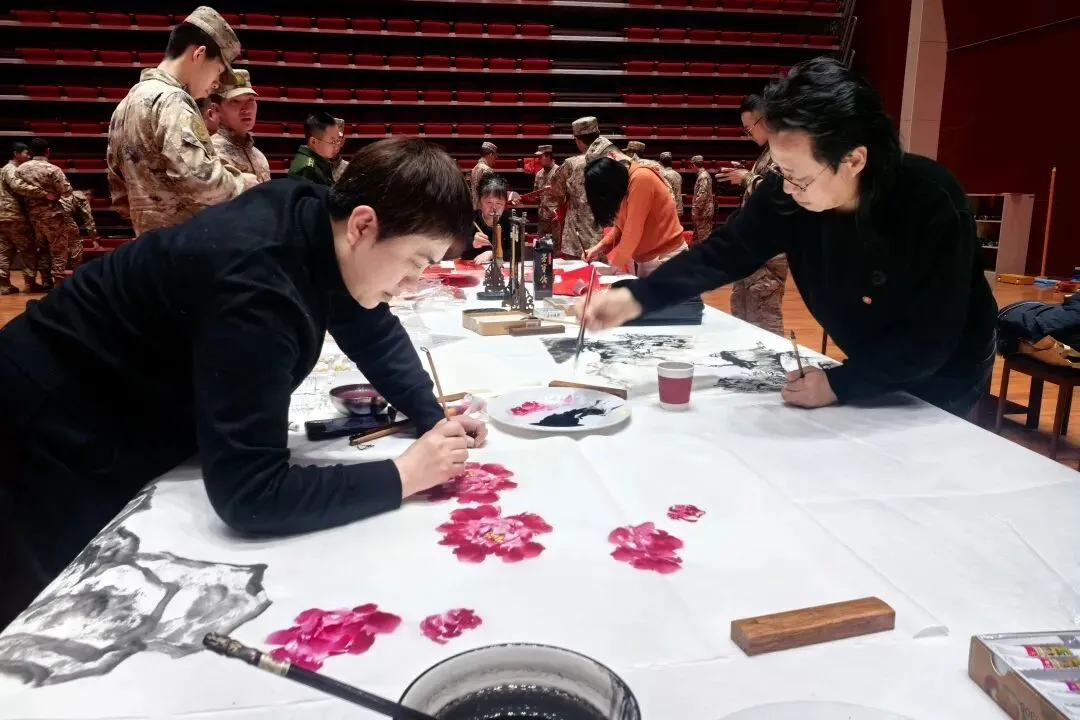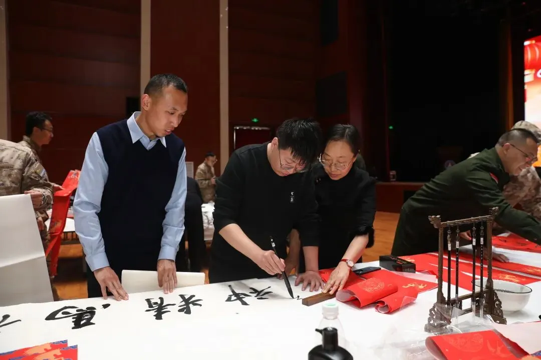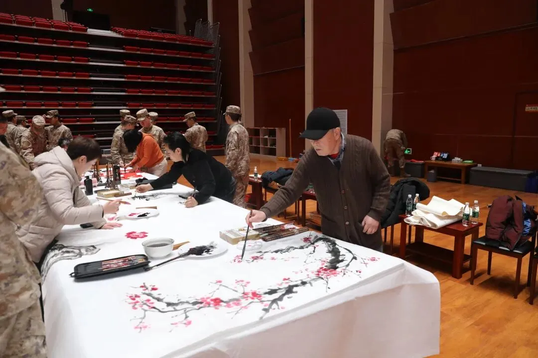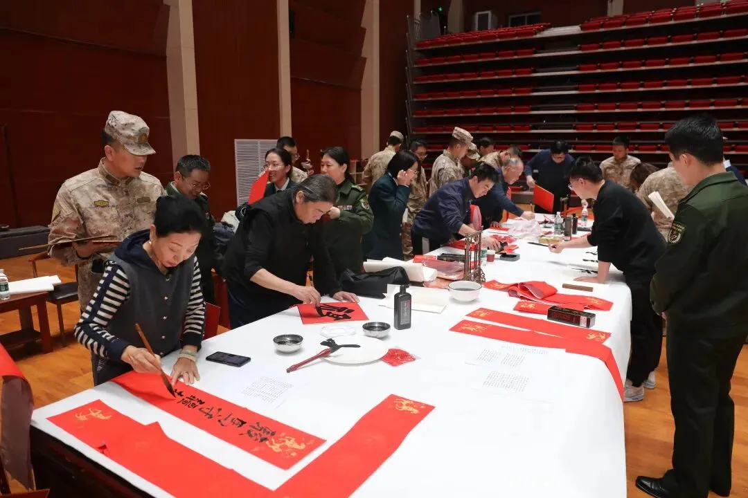 在部队多功能厅,书画艺术家们凝神聚气,挥毫落纸,淡淡的墨香与欢快的氛围交织,笔锋起转间,一副副饱含祝福的春联传递着对官兵们的美好祝愿。红卡纸上,形态各异的“福”字或饱满圆融,或潇洒飘逸;绘画案前,美术家们以水墨渲染山河,用线条勾勒花鸟,一幅幅国画作品跃然纸上,吸引官兵驻足欣赏。