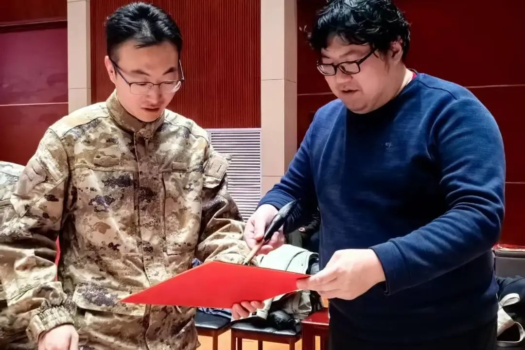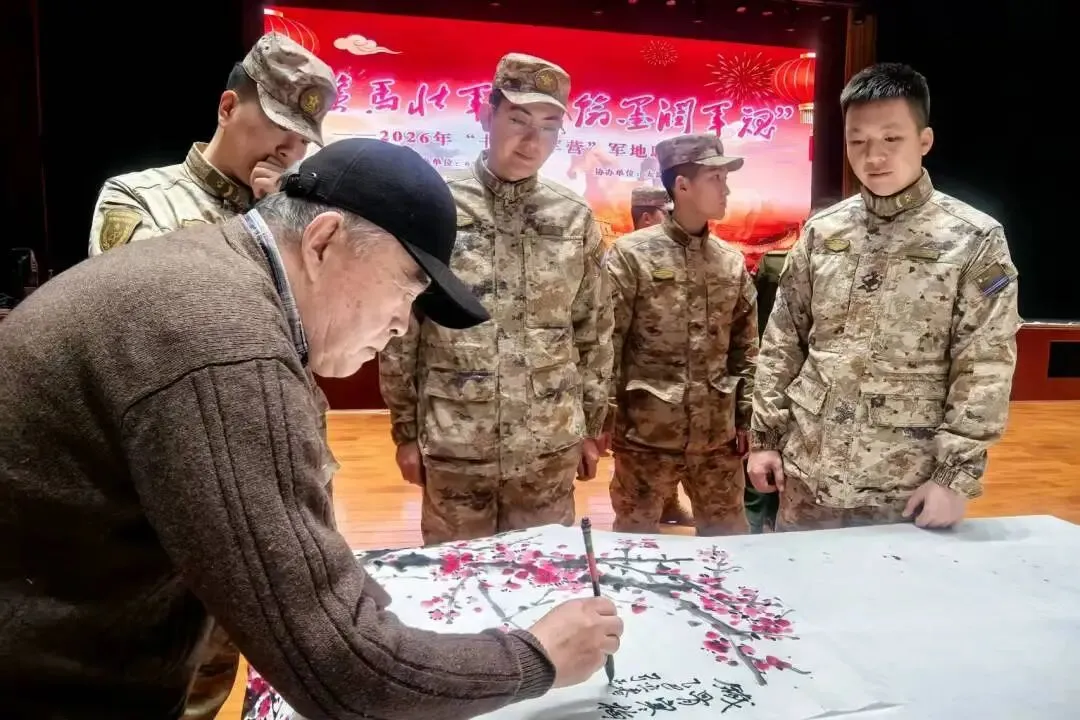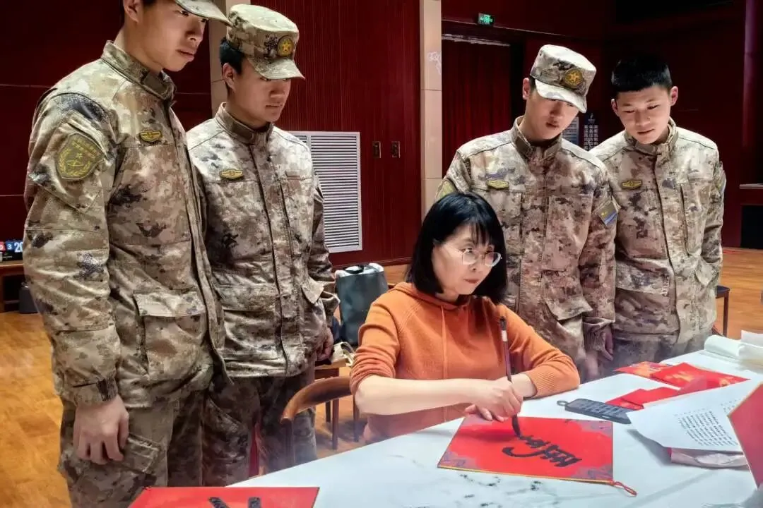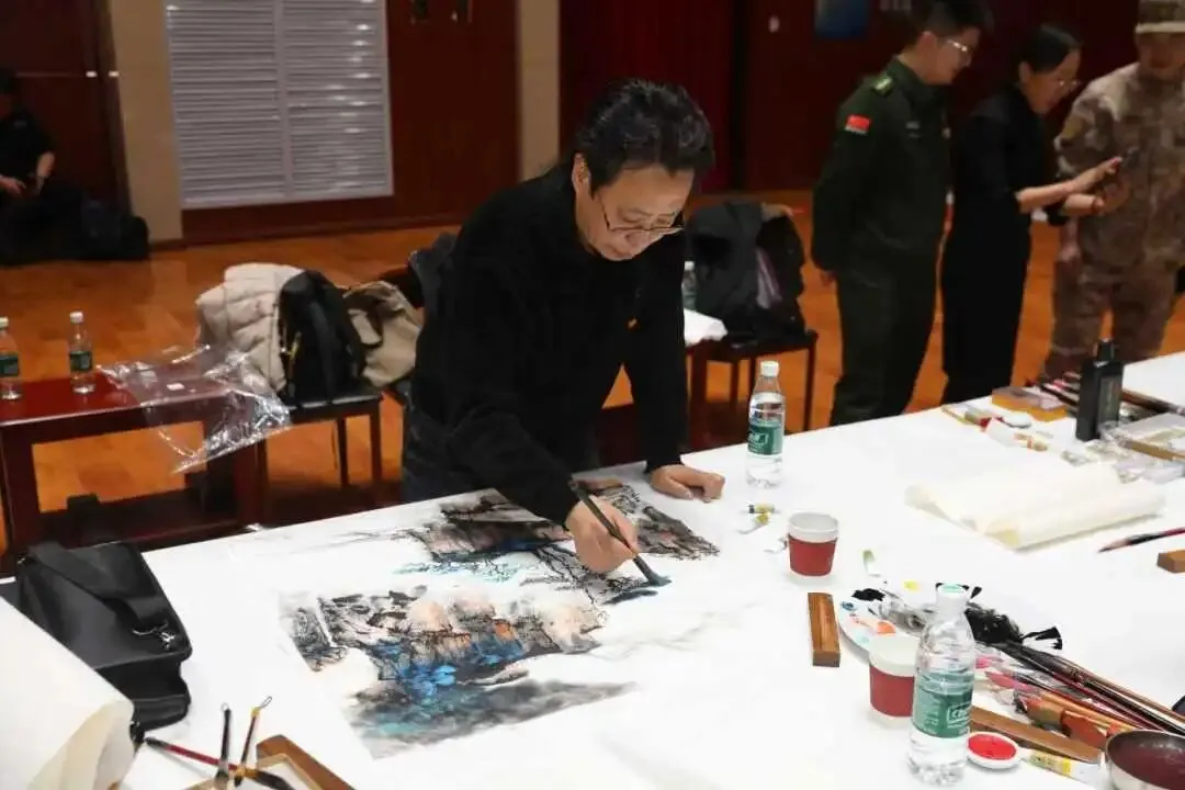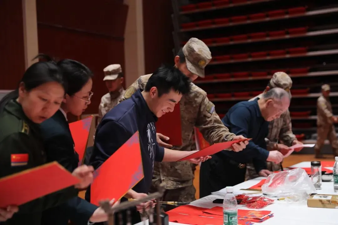 在部队多功能厅,书画艺术家们凝神聚气,挥毫落纸,淡淡的墨香与欢快的氛围交织,笔锋起转间,一副副饱含祝福的春联传递着对官兵们的美好祝愿。红卡纸上,形态各异的“福”字或饱满圆融,或潇洒飘逸;绘画案前,美术家们以水墨渲染山河,用线条勾勒花鸟,一幅幅国画作品跃然纸上,吸引官兵驻足欣赏。