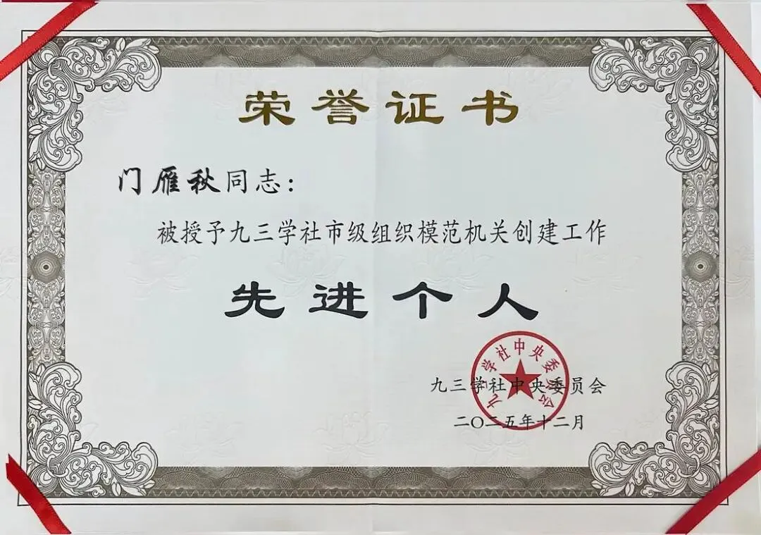 近日,九三学社第十五届中央委员会第三十九次主席办公会议研究决定授予全国53个市级组织“模范机关创建标兵单位”称号。九三学社大同市委会凭借务实的工作举措、鲜明的履职亮点、过硬的作风形象,以全省总分排名第一的优异成绩获评“市级组织模范机关创建标兵单位”称号,二级调研员、原专职副主委门雁秋获先进个人。