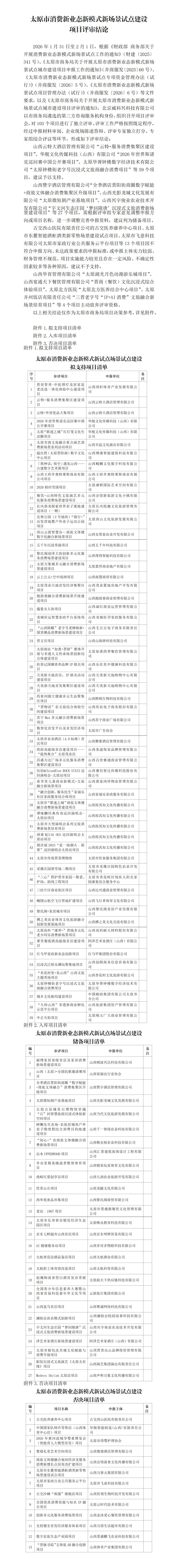 根据《财政部商务部关于开展消费新业态新模式新场景试点工作的通知》《太原市商务局关于开展太原市消费新业态新模式新场景试点城市建设项目评审的通知》,2026年1月31日至2月1日,市商务局遴选的独立第三方咨询服务机构组织召开了项目评审会,对申报项目进行独立评审。