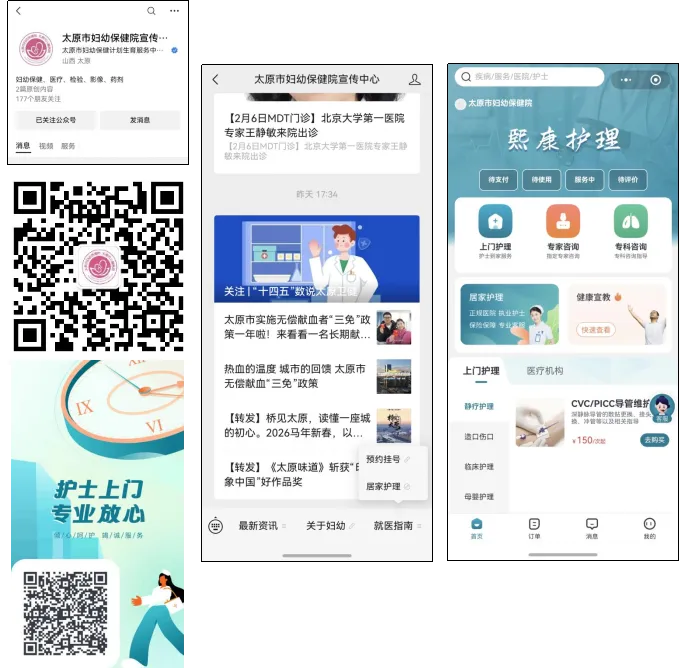 1、微信搜索“太原市妇幼保健院宣传中心”订阅号并关注,右下角“就医指南”菜单中点击“居家护理”进入,也可扫描护士二维码进入,或者扫描医院二维码进入。