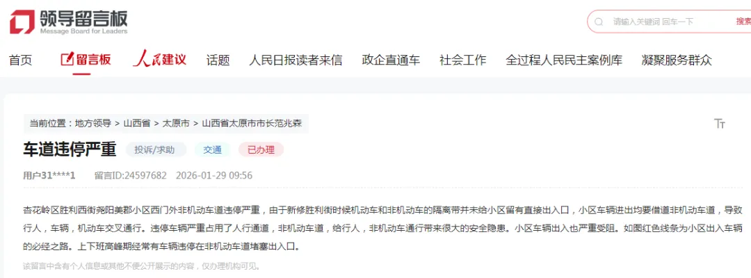 网友反映太原一处非机动车道违停严重,官方回应:增派警力!