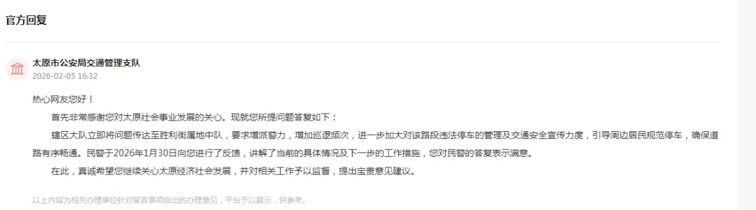 辖区大队立即将问题传达至胜利街属地中队,要求增派警力,增加巡逻频次,进一步加大对该路段违法停车的管理及交通安全宣传力度,引导周边居民规范停车,确保道路有序畅通。
