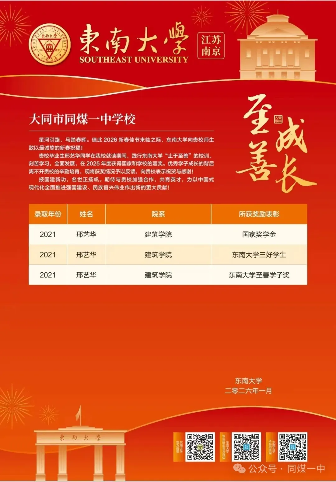 东南大学向我校发来喜报,祝贺我校学子在东南大学的优秀表现,感谢我校为东南大学输送了优秀的人才,并祝愿我校薪火相传,再创辉煌。