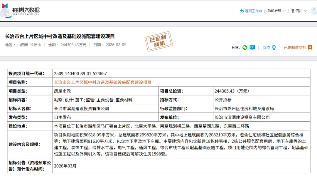 2026年2月5日,山西省招标投标公共服务平台发布了长治市台上片区城中村改造及基础设施配套建设项目的招标计划。该项目总投资24.43亿元,涵盖住宅楼、社区配套服务综合楼及配套基础设施等建设内容,为建筑行业相关企业提供了丰富的商业机会。