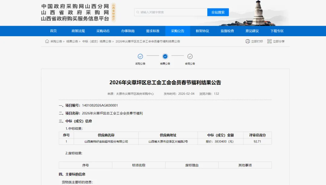 2026年2月4日至5日,美特好接连斩获太原尖草坪区总工会、万柏林区总工会、山西交通实业发展集团综合开发有限公司三项春节福利采购项目,累计中标金额约506.57万元。这得益于沉淀多年的本土供应链优势开始发力。