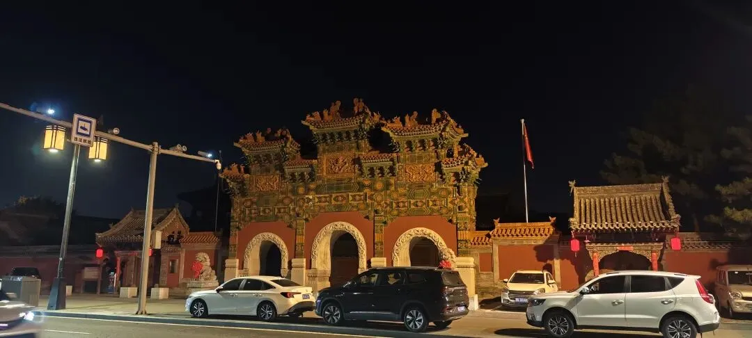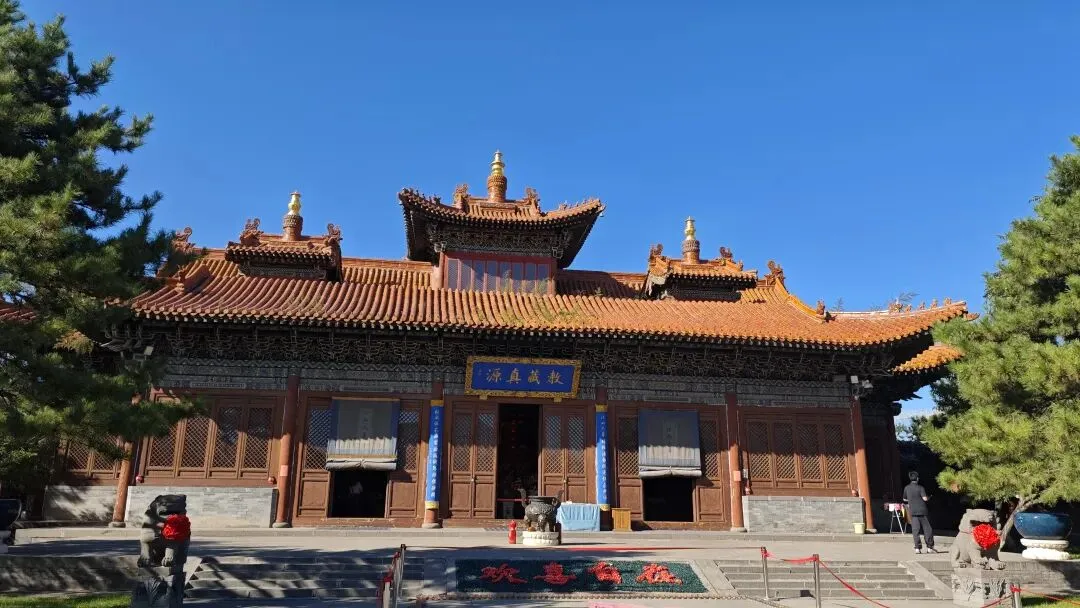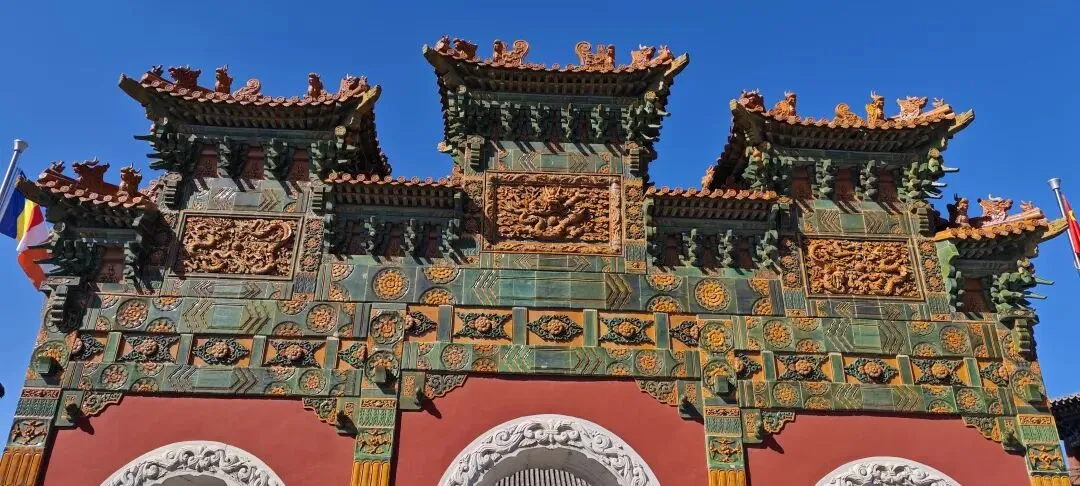 法华寺以琉璃牌坊替代传统山门,三间四柱七楼式琉璃牌楼为仿北京北海公园样式,装饰云龙浮雕。穿过牌坊,门楣上"法华禅寺"匾额与两侧砖雕"龙象庄严"图案。两侧的钟鼓楼采用罕见的圆亭式设计,顶部的铜铃随风摇曳时,其蒙古包式的穹顶外廓,让人联想到草原文明与农耕文化的混居融合。