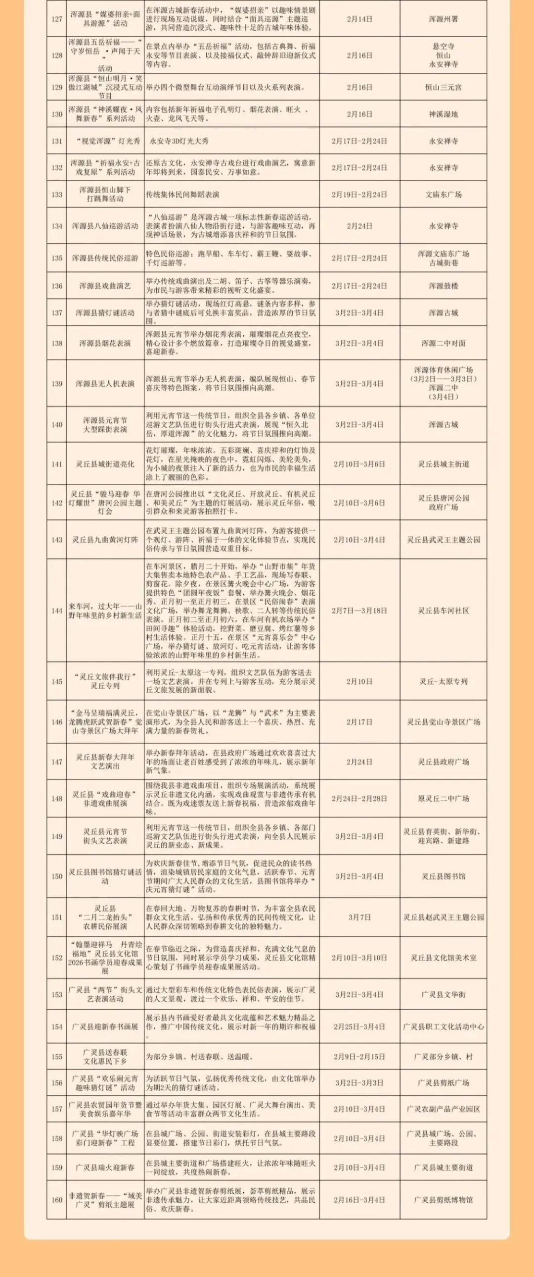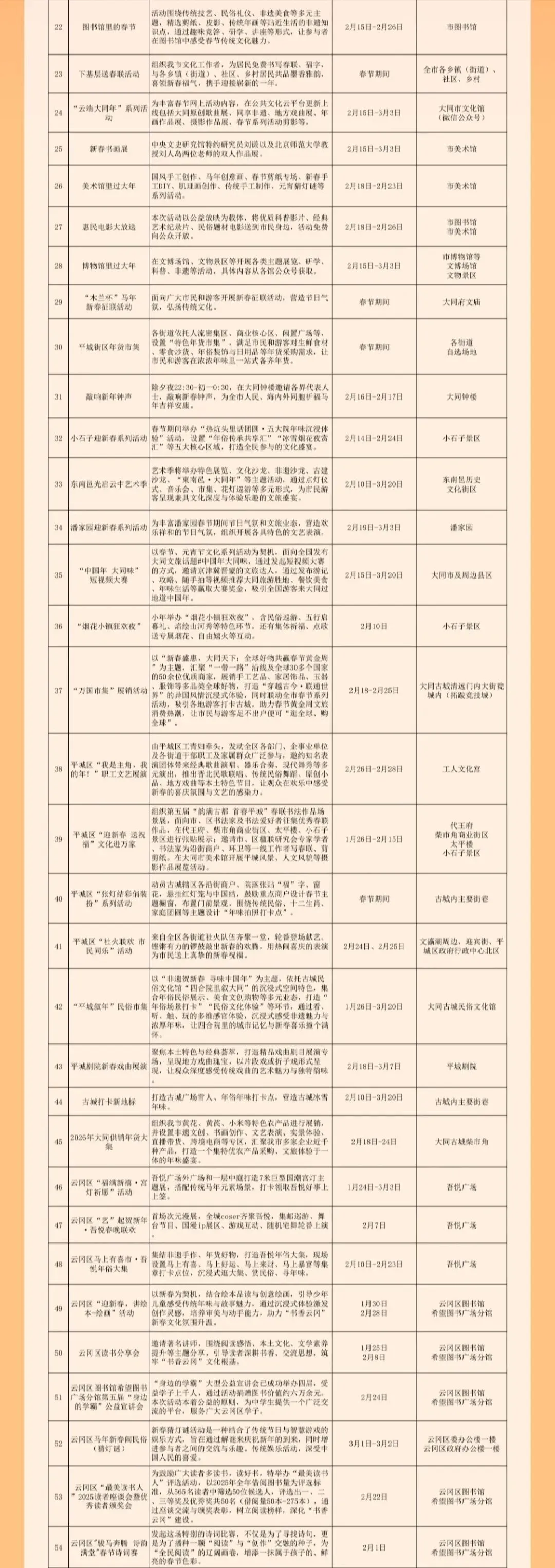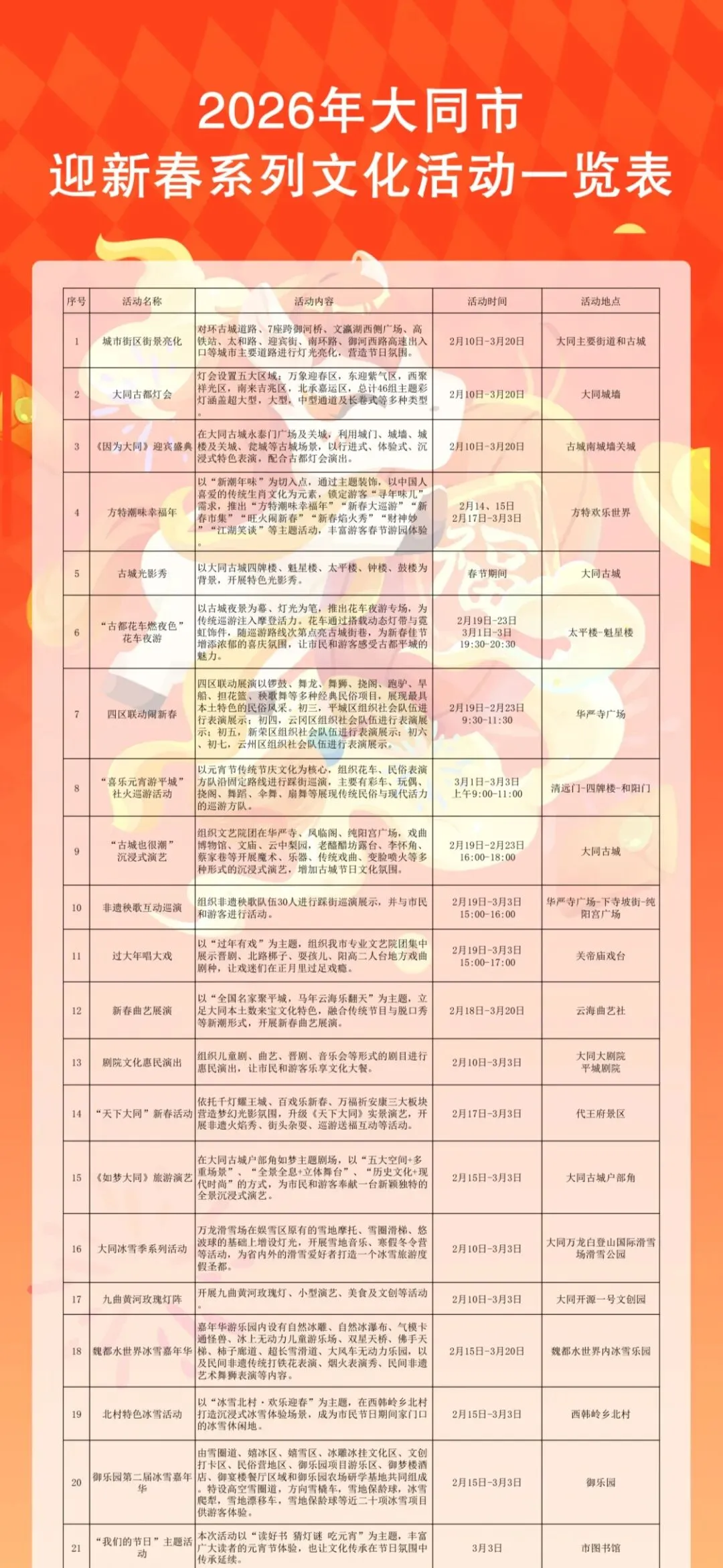 2月3日大同市人民政府新闻办公室召开专题新闻发布会,正式发布2026年“大同年 大不同”新春系列文化活动总体方案。系列活动将于2月10日(农历腊月廿三)至3月20日(农历二月廿二)举行,历时39天。活动以“市级引领、县区联动、全域覆盖”为原则,精心推出六大主题板块、共计160项特色文化活动,旨在为市民游客呈现一个兼具传统韵味与现代活力、安全有序、全民共享的马年新春佳节。