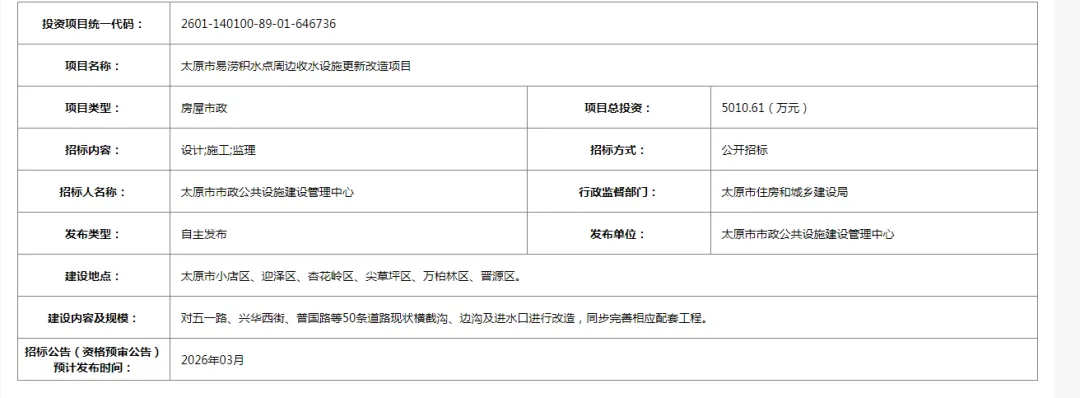 记者从全国公共资源交易平台获悉,太原市易涝积水点周边收水设施更新改造项目招标信息已发布。