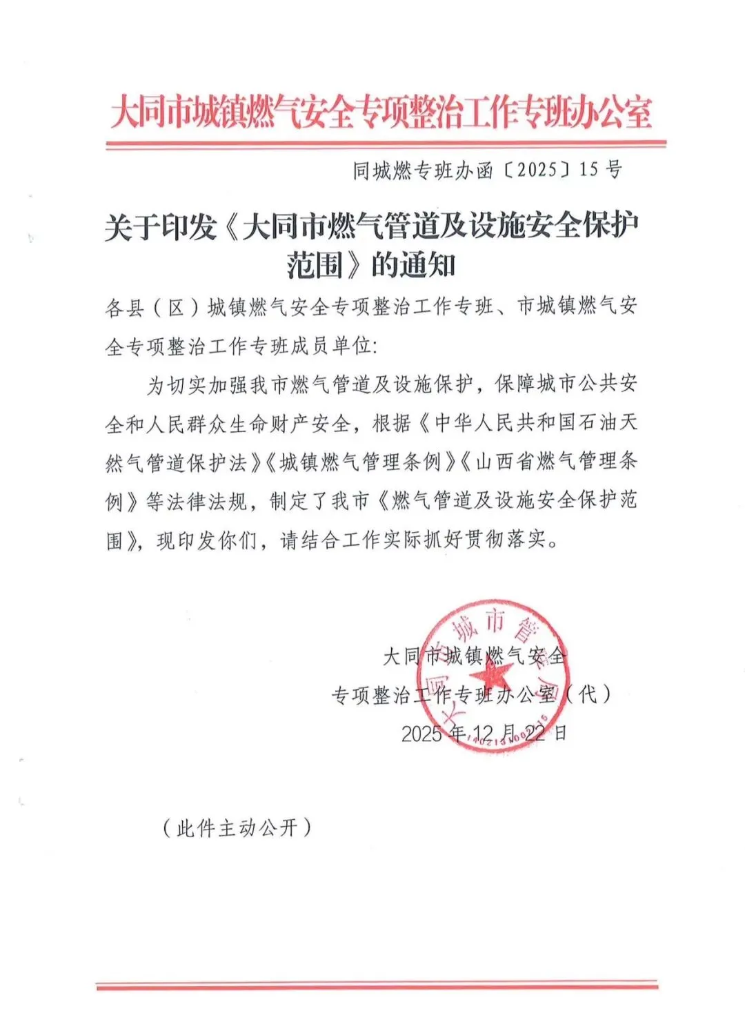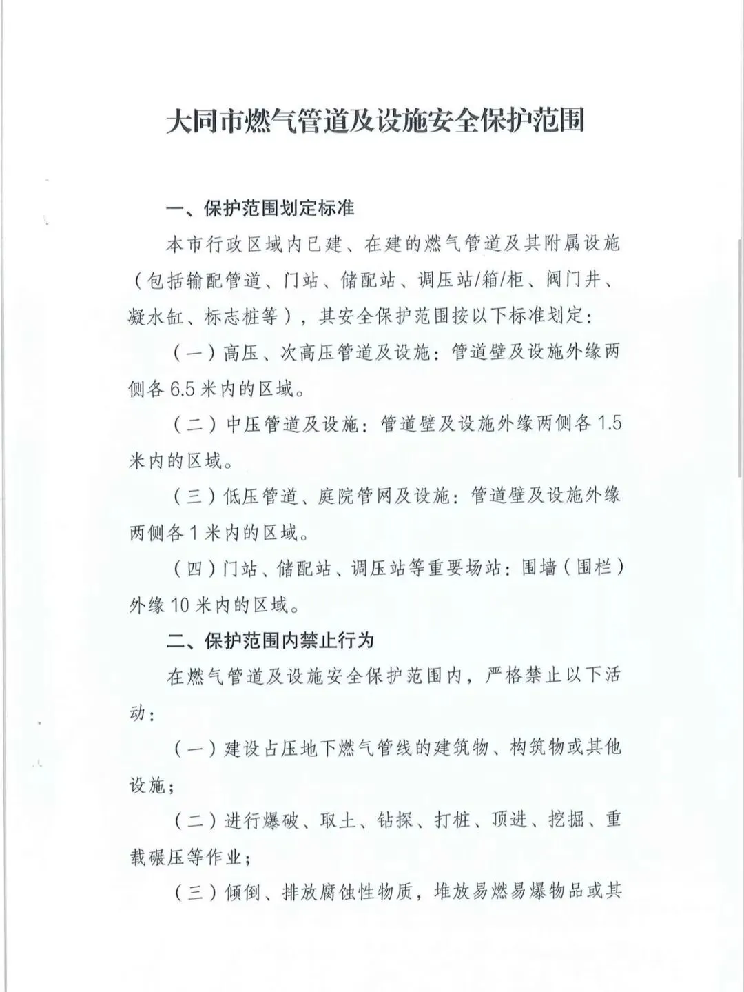 关于印发《大同市燃气管道及设施安全保护范围》的通知