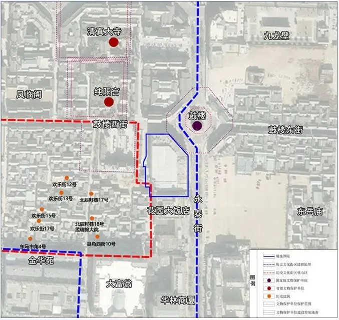 调查评估范围为大同古城鼓楼西街南侧,永泰街西侧地块,四至范围:北至鼓楼西街,东至永泰街,南至花园大饭店,西至纯阳宫广场,用地面积6103.4平方米。