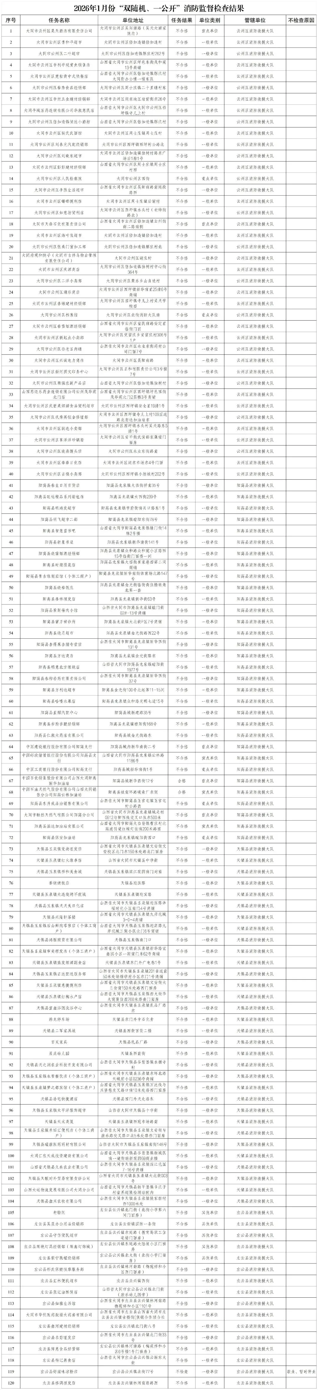为贯彻落实《消防救援局关于全面推行“双随机、一公开”消防监管工作的通知》(应急消〔2019〕241号)及省消防救援总队《全面推行“双随机、一公开”消防监管工作实施方案》(晋消办〔2019〕121号),认真组织实施“双随机、一公开”消防监管工作,现将2026年1月份“双随机、一公开”消防监督检查结果公示如下: